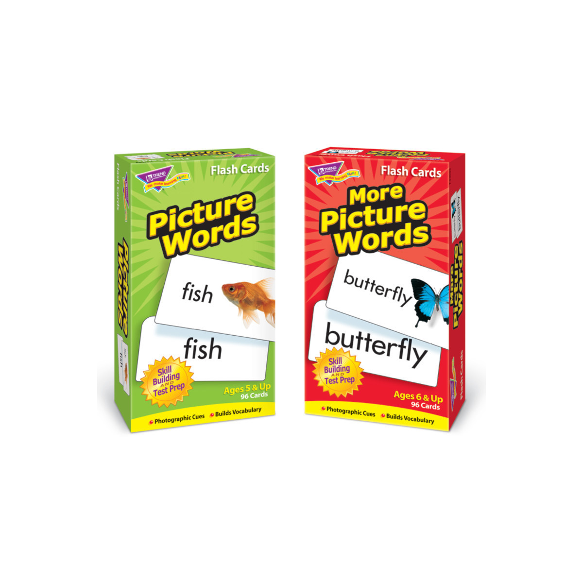 Convenient two-pack of English-language flash cards for classroom or home. Content-rich picture vocabulary cards help students build recognition and fluency with words from Dolch and Fry Instant Words lists. Photos for real-life learning. Word on front; word with picture on card back. Sturdy cards and storage boxes. Students will delight in mastering new skills. No-see-through cards with quick-sorting, rounded corners. Cards measure 3" x 6". Each pack has 96 cards.