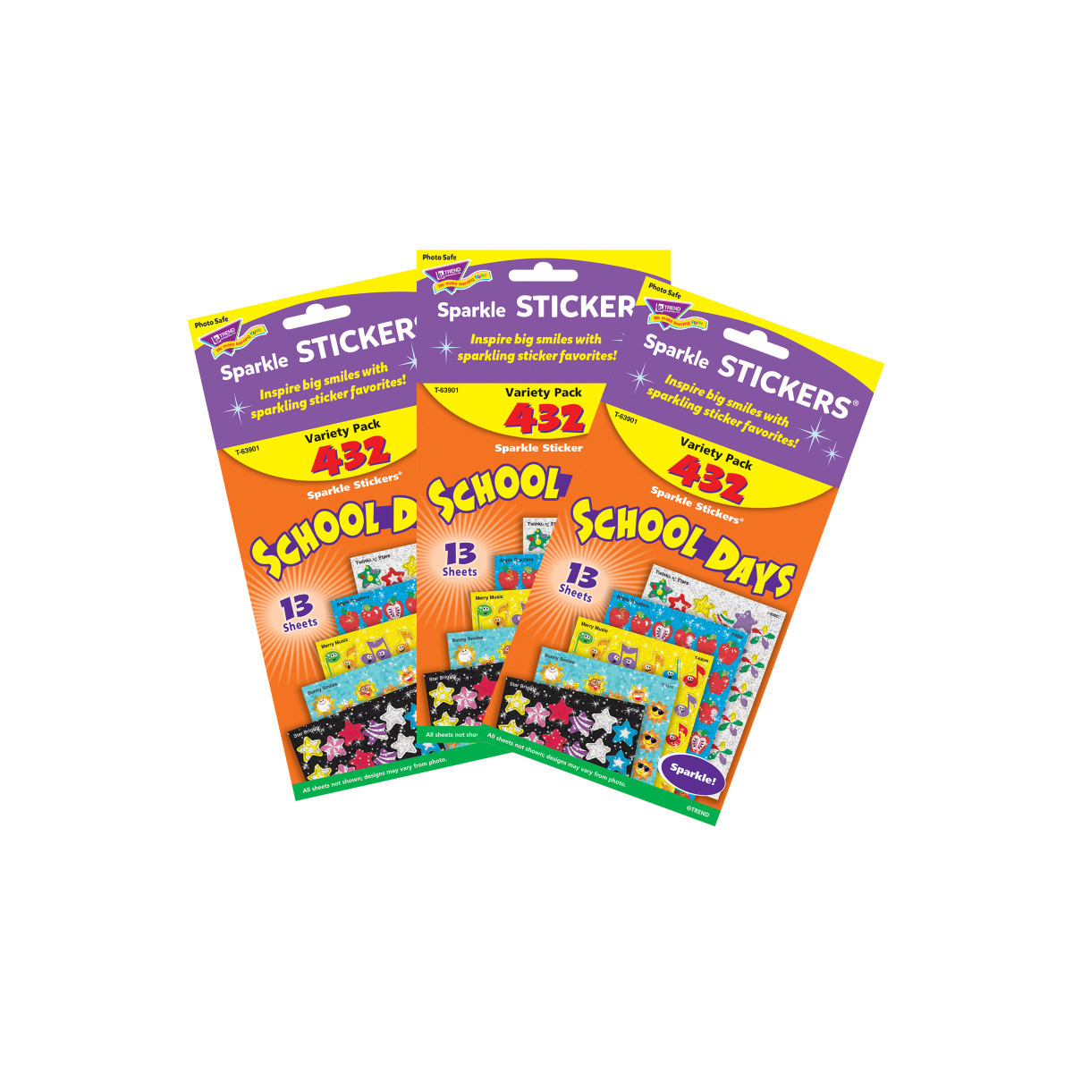 Little sparklers are a big hit with kids! They're just the right size to put on homework and reward good behavior. This variety pack includes Apple Dazzlers, Twinkling Stars, Merry Music, Brilliant Birthday, Sunny Smiles, and Star Brights. Stickers are acid free, nontoxic, and safe for use on photos. Each pack includes 432 stickers in 43 designs. Sold as 3 packs for a total of 1296 stickers.