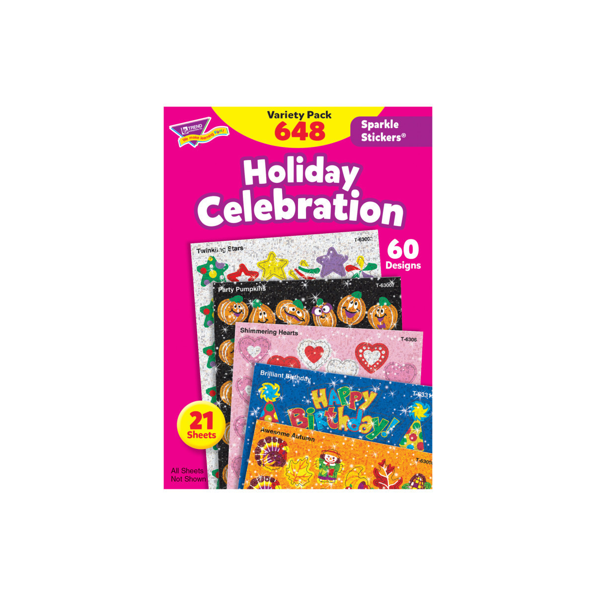 Little sparklers are a big hit with kids! They're just the right size to put on homework and reward good behavior. This variety pack includes Twinkling Stars, Party Pumpkins, Halloween Sparkles, Awesome Autumn, Christmas Joys, Brilliant Birthday, Sunny Smiles, Proud Hearts, and Shimmering Hearts. Stickers are acid free, nontoxic, and safe for use on photos. Each pack includes 648 stickers in 60 designs.