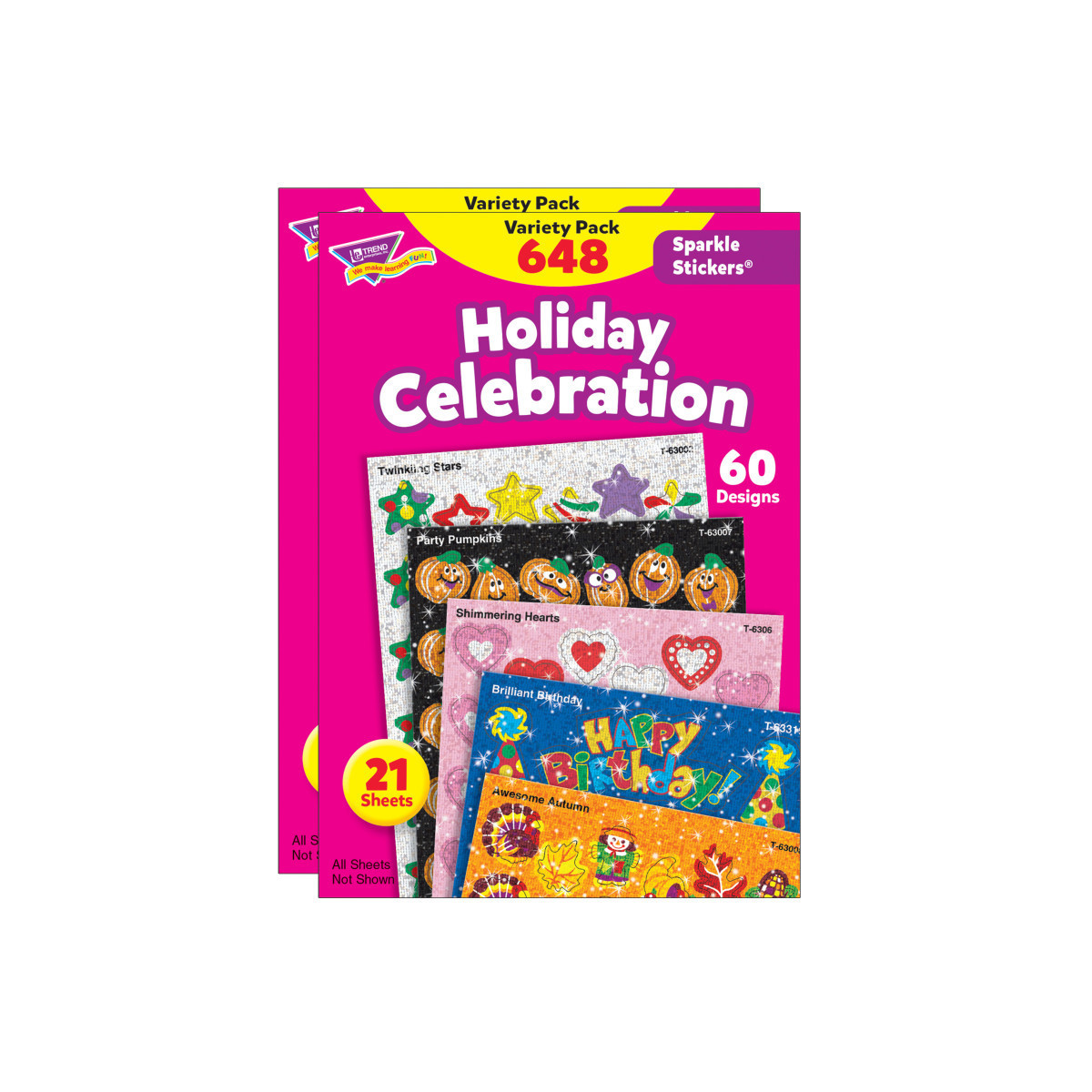 Little sparklers are a big hit with kids! They're just the right size to put on homework and reward good behavior. This variety pack includes Twinkling Stars, Party Pumpkins, Halloween Sparkles, Awesome Autumn, Christmas Joys, Brilliant Birthday, Sunny Smiles, Proud Hearts, and Shimmering Hearts. Stickers are acid free, nontoxic, and safe for use on photos. 60 designs, 648 stickers per pack. Sold as 2 packs for a total of 1296 stickers.