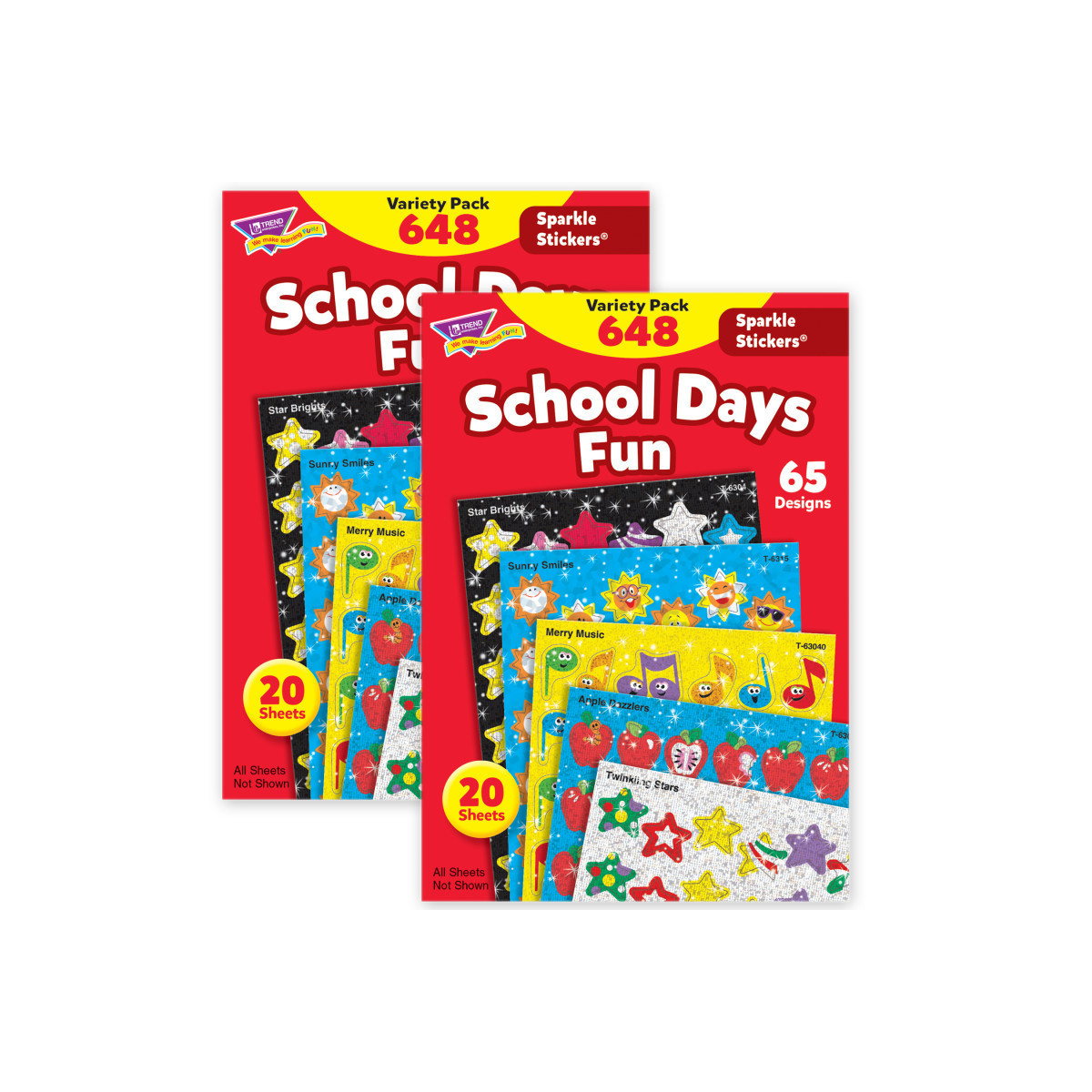 Little sparklers are a big hit with kids! They're just the right size to put on homework and reward good behavior. This variety pack includes Apple Dazzlers, Twinkling Stars, Merry Music, Brilliant Birthday, Sunny Smiles, and Star Brights. Stickers are acid free, nontoxic, and safe for use on photos. Each pack includes 648 stickers in 65 designs. Sold as 2 packs for a total of 1296 stickers.