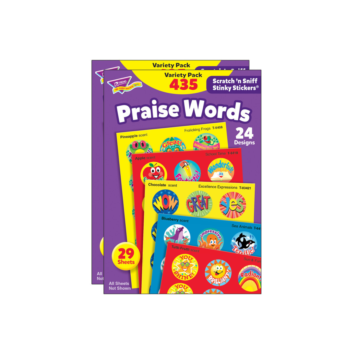 - 24 designs, 435 stickers, 8 scents per pack. Sold as 2 packs, 870 stickers total.