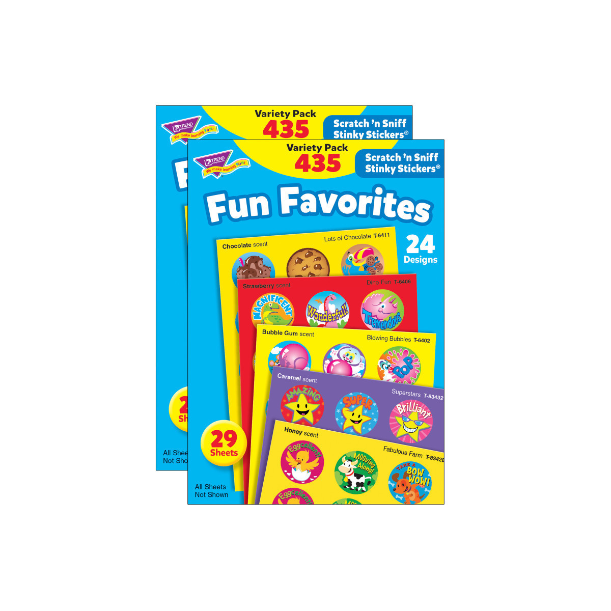 Scratch 'em and sniff 'em for a burst of fragrance! Everyone's favorite stickers, Stinky Stickers are fun to collect or use to motivate and reward. Designs include Superstars, Bubbles, Furry Friends, School Time, Peppermints, Dino Fun, Chocolate, and Farm. Designs may vary. Acid-free, nontoxic, and safe for use on photos. 24 designs, 8 scents, 435 sticker per pack. Sold as 2 packs for a total of 870 stickers.