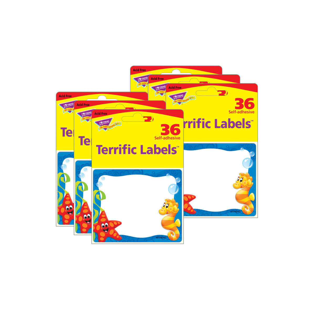 Bright and welcoming labels are acid free and designed for no-smear writing with markers or pens. Perfect for name tags, labels stay put and won't leave residue on clothes! Also great for cubbies, lockers, storage boxes, envelopes, learning centers, and so much more. Self-adhesive. Labels measure 2.5" x 3". Each pack includes 36 labels. Sold as 6 packs for a total of 216 labels. Coordinates with Sea Buddies™ Collection.