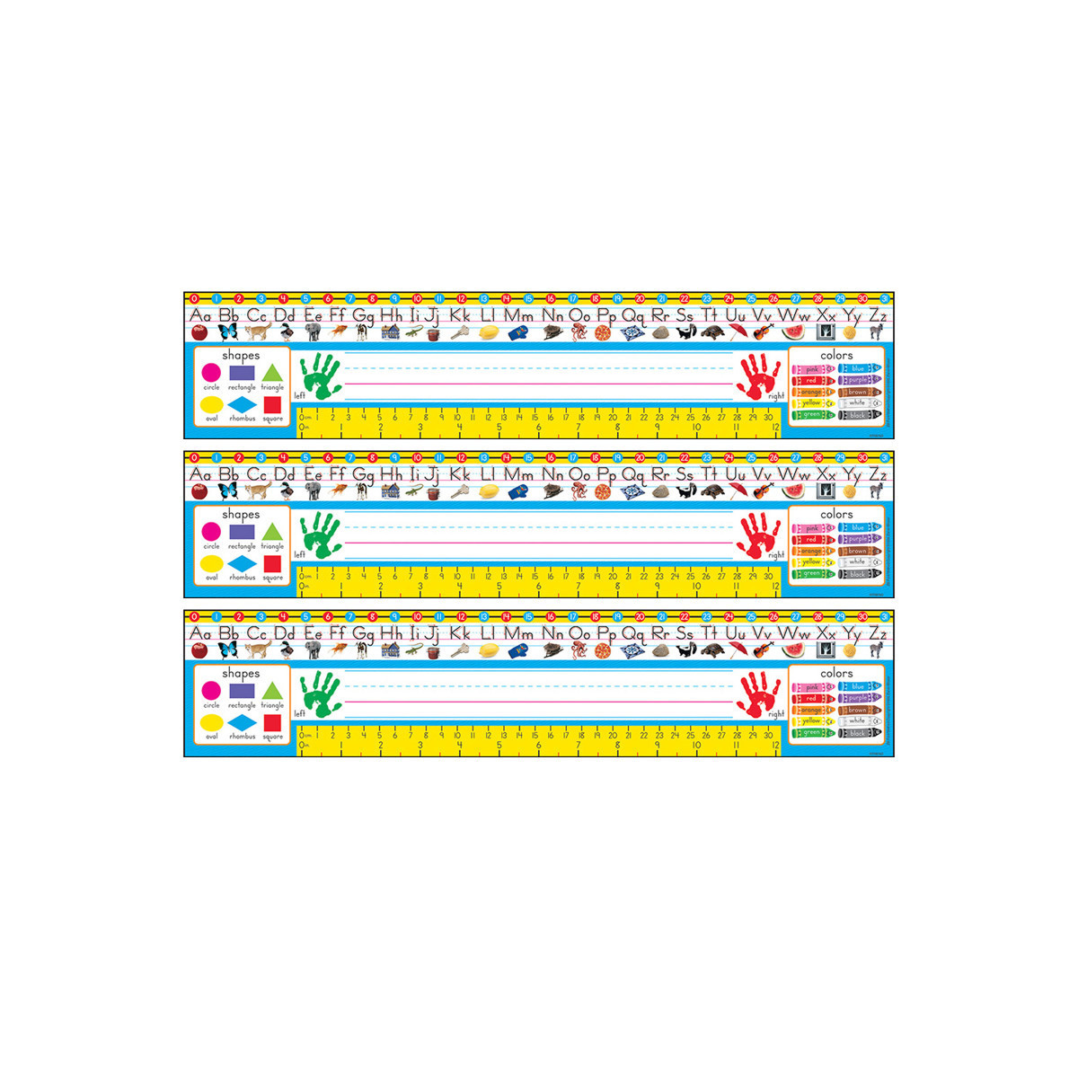 Put a world of facts at children's fingertips. These name plates are grade-appropriate, and feature language arts and math facts. 36 per pack, 3.75" x 18". Sold as 3 packs for a total of 108 name plates.