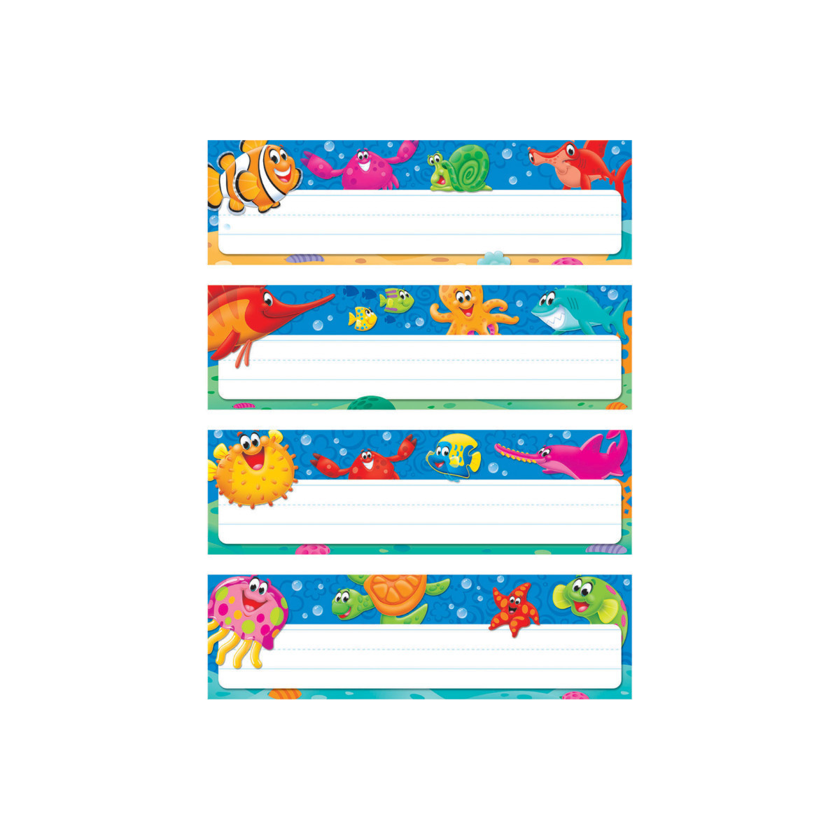 Delight children with a wide range of wonderfully whimsical name plates that deliver an amazing range of labeling options ... everything from showcasing their names to delivering fun messages. Invite students to select their favorites to label their desks and lockers. Four designs per pack make it easy to group students. So many uses! Writing guidelines on name plates for printing and writing practice. 4 designs, 32 per pack. 2 7/8'' x 9 1/2''. Coordinates with Sea Buddies™ Collection.