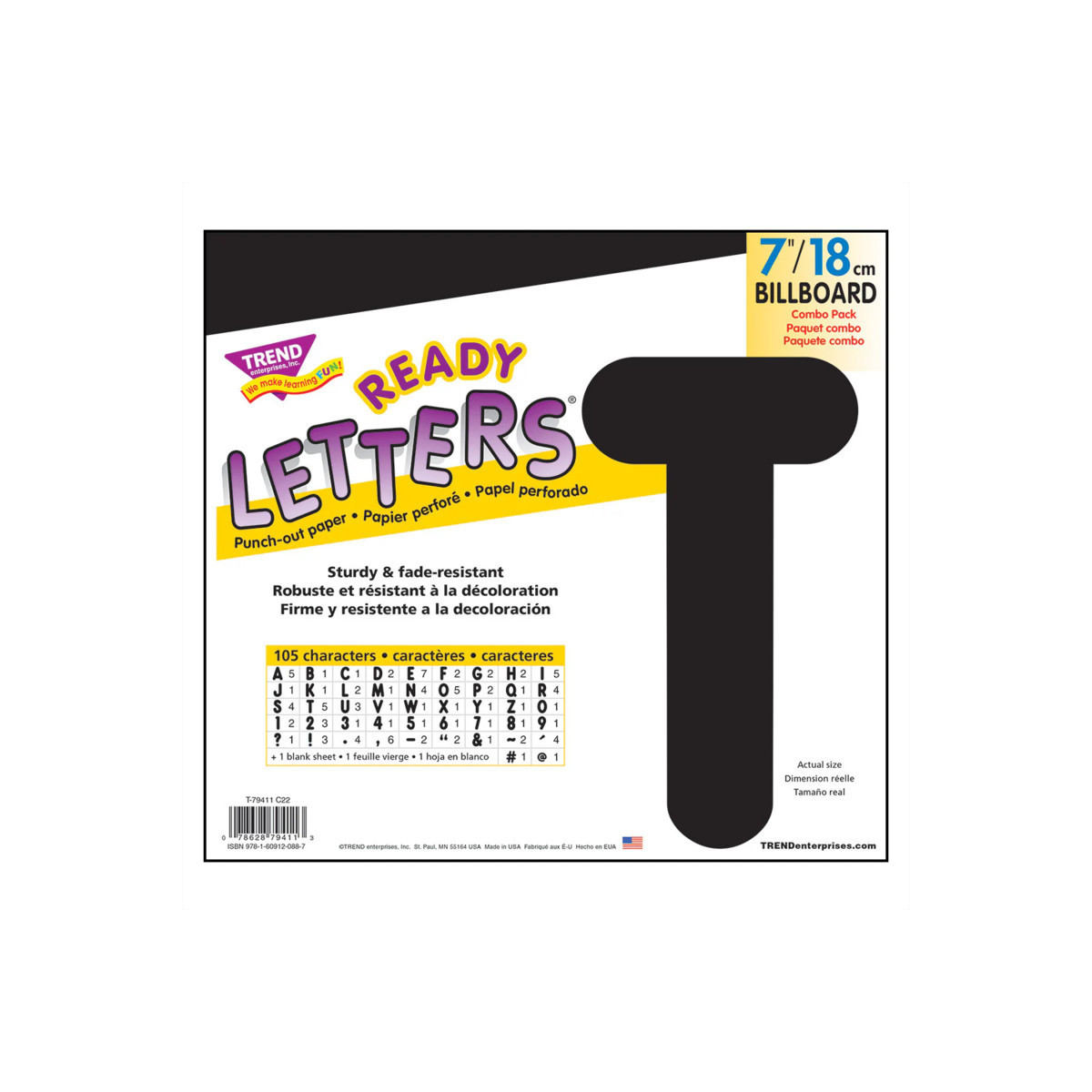Lively letters, limitless possibilities! Convenient, reusable, and easy to use. Great for student work displays, bulletin boards, signs, banners, news boards, learning activities, labeling, and much more! Fade-resistant colors coordinate with TREND products. Durable. Includes 66 uppercase letters, 13 numerals 0-9, 19 punctuation marks, 7 Spanish accent marks, and 1 blank sheet.