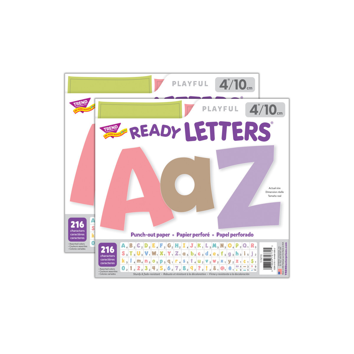 Lively letters ... limitless possibilities! Convenient, reusable, and easy to use! Great for student work displays, bulletin boards, signs, banners, news boards, learning activities, labeling, and much more! Fade-resistant colors coordinate with TREND products. Durable and reusable. Each pack includes 216 pieces: 59 uppercase letters, 84 lowercase letters, 20 numerals 0-9, 35 punctuation marks, and 18 Spanish accent marks. Sold as 2 packs for a total of 432 pieces.