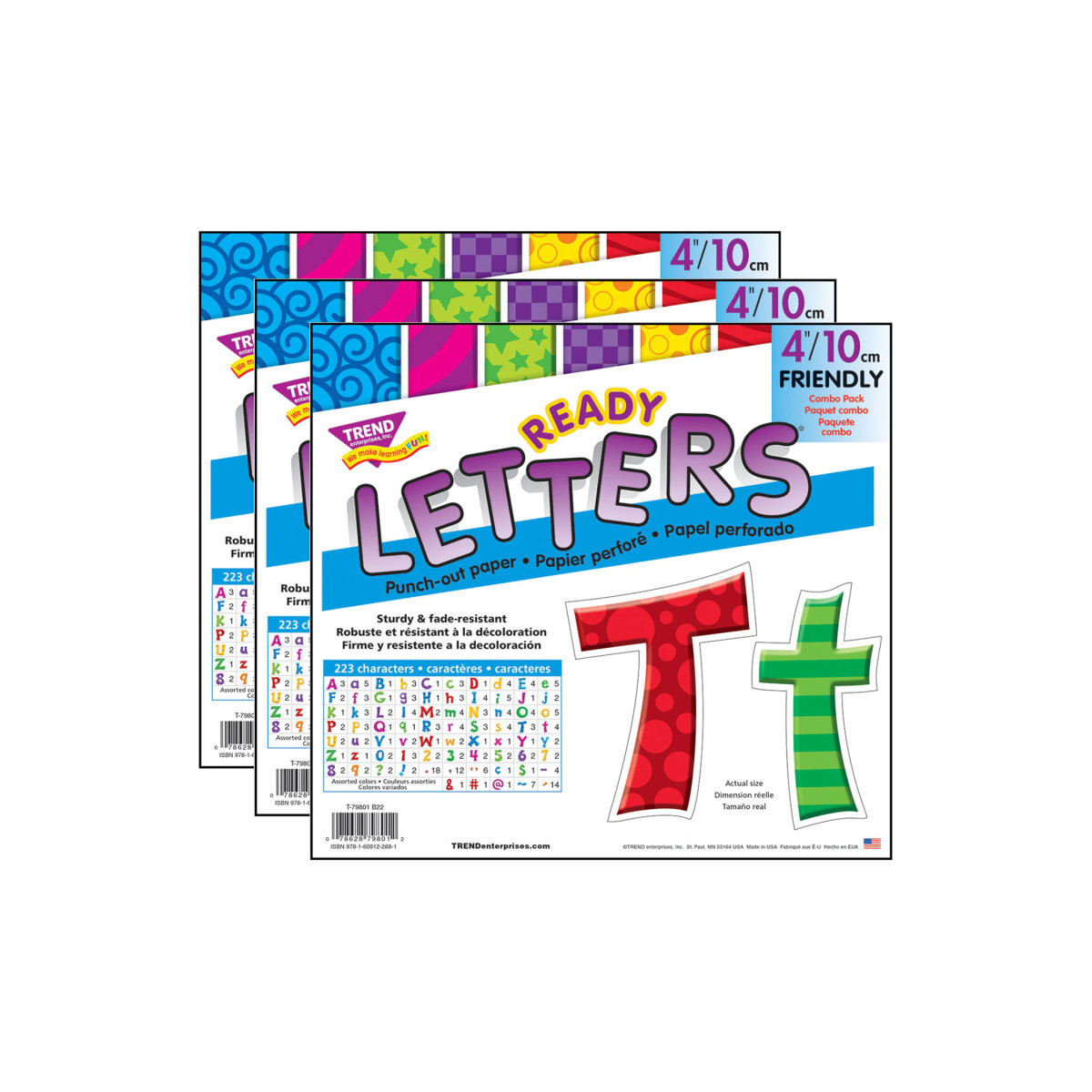 Lively letters, limitless possibilities! Convenient, reusable, and easy to use. Great for student work displays, bulletin boards, signs, banners, news boards, learning activities, labeling, and much more! Fade-resistant colors coordinate with TREND products. Durable. Each pack includes 50 uppercase letters, 82 lowercase letters, 21 numerals 0-9, 44 punctuation marks, and 28 Spanish accent marks in assorted colors and patterns. Sold as 3 packs. Coordinates with Furry Friends Collection.
