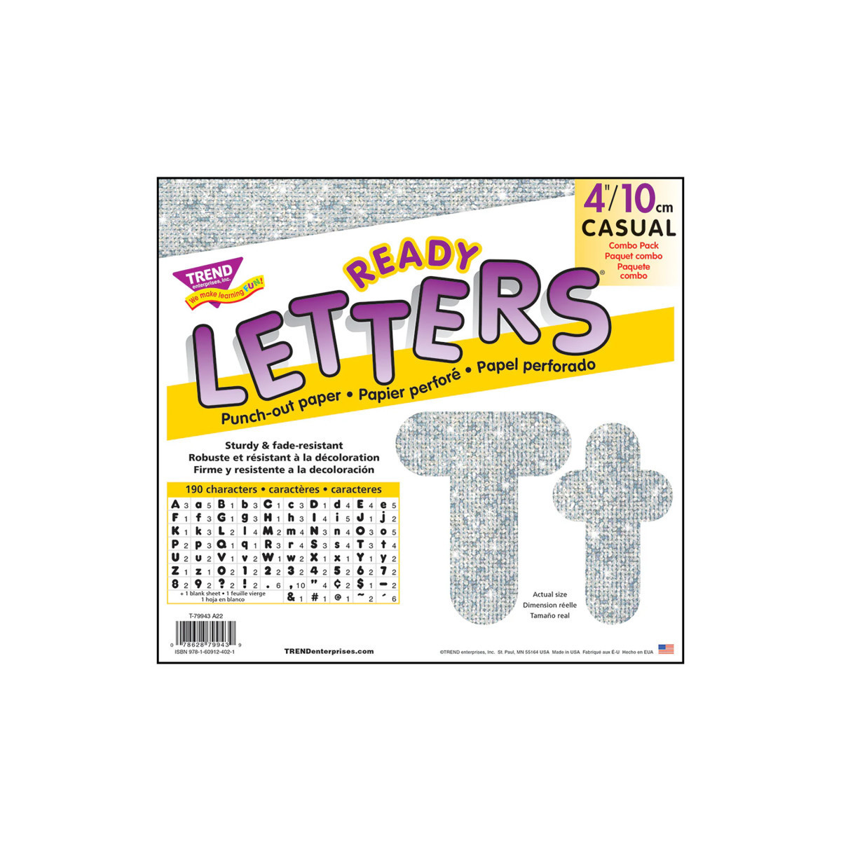 Lively letters, limitless possibilities! Convenient, reusable, and easy to use. Great for student work displays, bulletin boards, signs, banners, news boards, learning activities, labeling, and much more! Fade-resistant colors coordinate with TREND products. Durable. Each pack includes 50 uppercase letters, 82 lowercase letters, 20 numerals 0-9, 30 punctuation marks, and 1 blank sheet.
