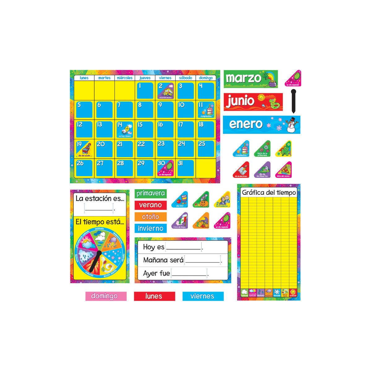 Here's a great Spanish calendar for the classroom, home, and office. Highlight holidays and special days with colorful tabs that easily slide into the calendar. Includes 17 1/2" x 23 1/4" calendar, 12 month labels, 7 days of the week labels, 4 seasons labels, season/weather chart, 33 date markers, 44 holiday/special day markers, Today/Tomorrow/Yesterday chart, weather graph, and 2 arrows. 106 pieces. Includes a Discovery Guide with creative activities that teach and delight!