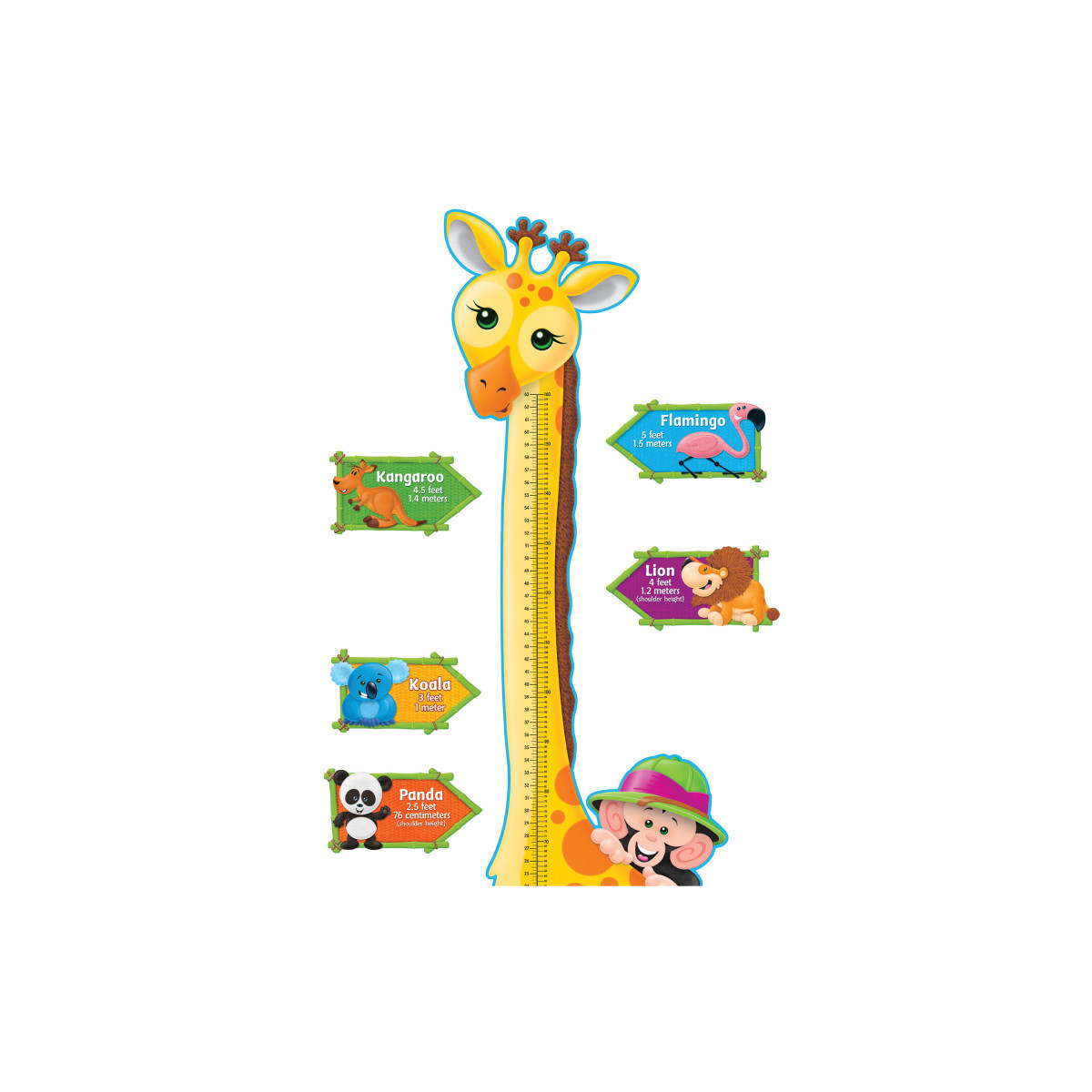 Track growing children! Includes 3-piece giraffe, 5 height cards, and downloadable recording chart. Measure in inches and centimeters. 8 pieces; giraffe is 6' tall assembled. Includes a Discovery Guide with creative activities that teach and delight! Coordinates with the Monkey Mischief Collection.
