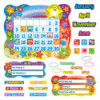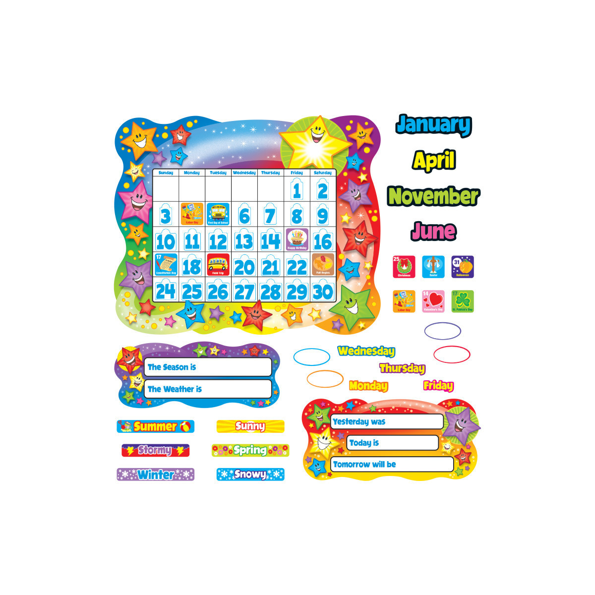 Rainbow-bright colors and lots of extras! Includes 26" x 31" calendar, 12 month labels, 7 days of the week labels, 4 seasons labels, 2 sets of 33 date markers, 62 special day markers, 7 weather labels, Yesterday/Today/Tomorrow sign, Season/Weather sign, and 4 blank signs for customization. 165 pieces. Includes a Discovery Guide with creative activities that teach and delight!