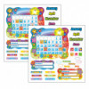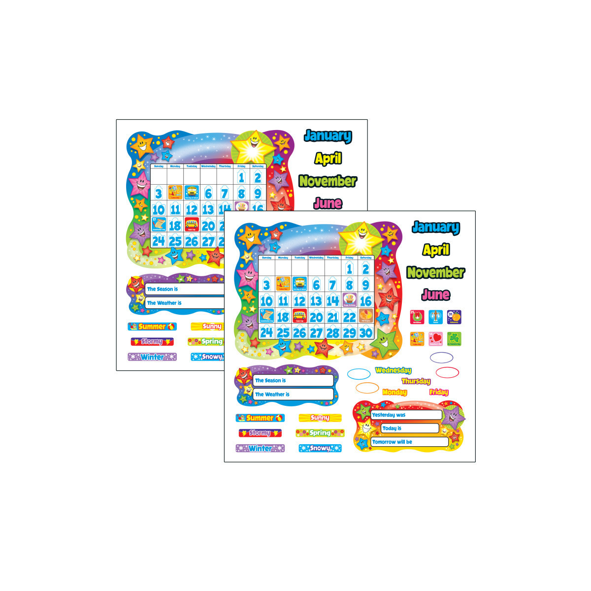 Rainbow-bright colors and lots of extras! Includes 26" x 31" calendar, 12 month labels, 7 days of the week labels, 4 seasons labels, 2 sets of 33 date markers, 62 special day markers, 7 weather labels, Yesterday/Today/Tomorrow sign, Season/Weather sign, and 4 blank signs for customization. 165 pieces. Includes a Discovery Guide with creative activities that teach and delight! Sold as 2 bulletin board sets.