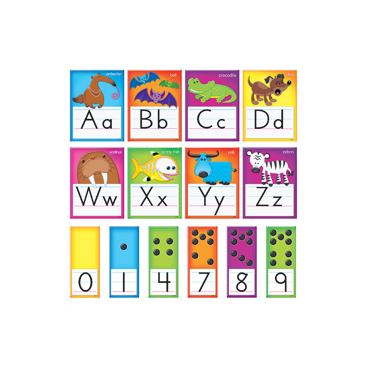 26 alphabet cards, 6 1/2" x 8 1/2" each. Includes numbers 0-9 with counting dots.
