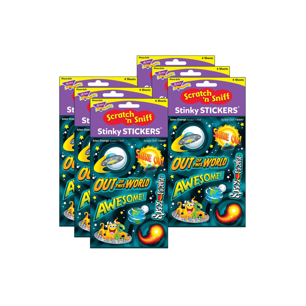 Far out FUN! The alien orange scent and motivational phrases make these stickers favorites of kids and adults. Give to encourage, reward, or just because. Decorate crafts, cards, folders, journals, and more. The designs coordinate with enCOWnter™ Three Corner™ Card Game. Use them for fun game night prizes, party favor bags, and combine with the game for a cosmically-cool gift. Each pack includes 32 stickers in 8 designs. Sold as 6 packs for a total of 192 stickers.