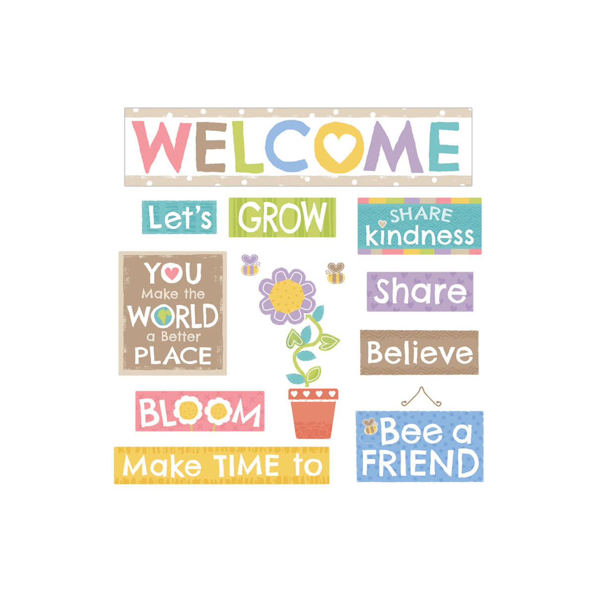 Create a kind and encouraging learning environment with the Always Welcome Bulletin Board Set. Large welcome sign and buildable phrases & posters can be combined in endless ways to make an inviting space. Nature-inspired messages, accents, and colors can be used to welcome everyone, celebrate achievements, encourage one another, and spread kindness. Large welcome sign (36" wide), 16 mix 'n match phrases & words, and 12 nature-themed accents included.