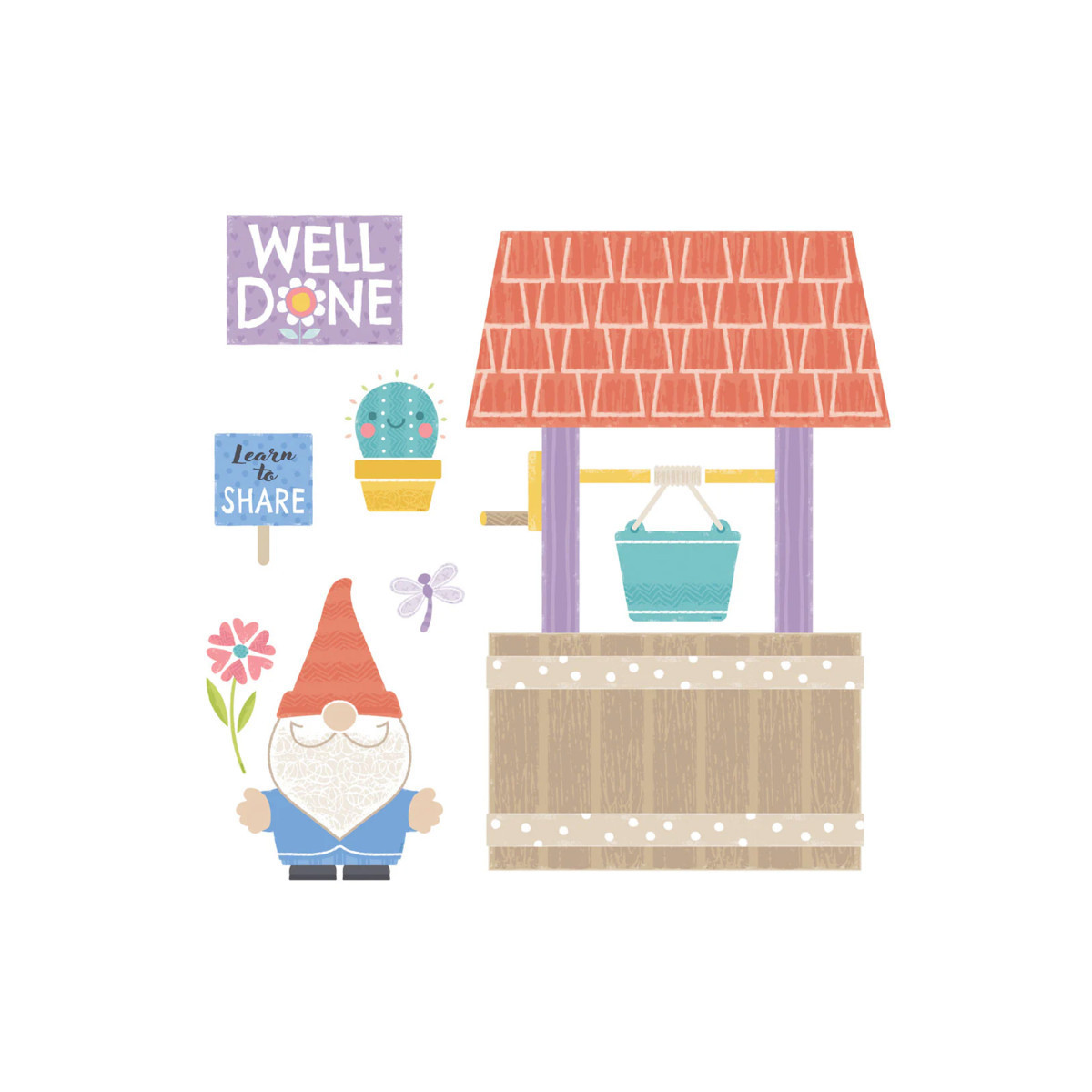 Plant seeds of encouragement and watch them grow! Inspire success through playful touches of nature with this bulletin board set. Combine large wishing well and coordinated accents in endless ways to make an inviting, nurturing space that spreads kindness, encourages each other, celebrates achievements, and sets goals. 37 pieces include 25-3/4" tall wishing well, bucket, 2 stackable garden potting benches, 15" wide water feature, 3 large signs, watering can with separate water stream, small garden shovel, 5 garden signs, 9 critters, 11 plants, and one gnome. Printed with vivid, fade-resistant inks on durable paper stock. Made in USA.