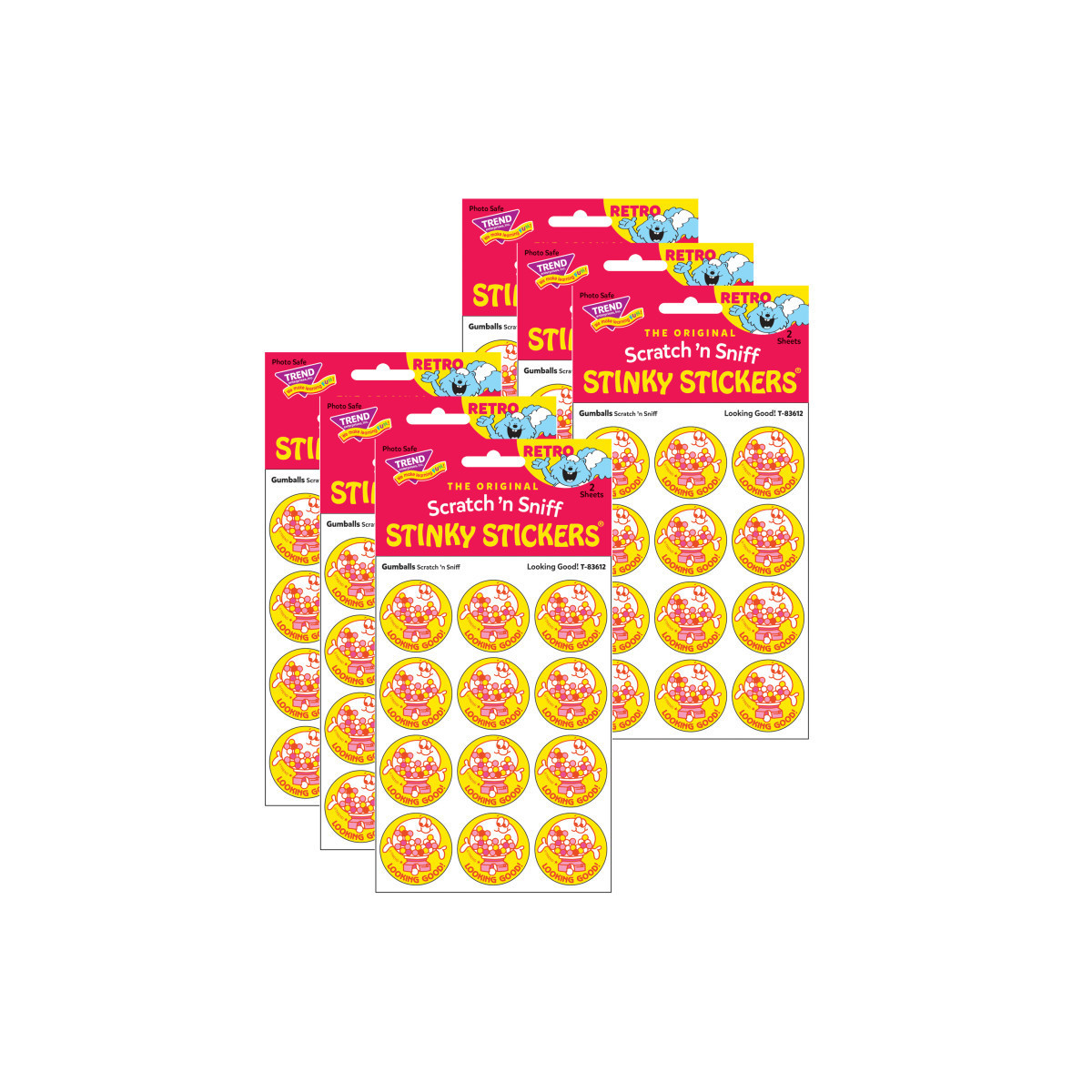 Get a whiff of this Looking Good!, gumballs-scented sticker! TREND Scratch 'n Sniff Stinky Stickers from the '80s are BACK! Fun to collect, trade, and celebrate accomplishments and special occasions. Collectors will be happy to spot the star symbol to distinguish TREND Retro Stinky Stickers from those printed in the 1980s. Each pack includes 24 stickers on 2 sheets. Sold as 6 packs for a total of 244 stickers.