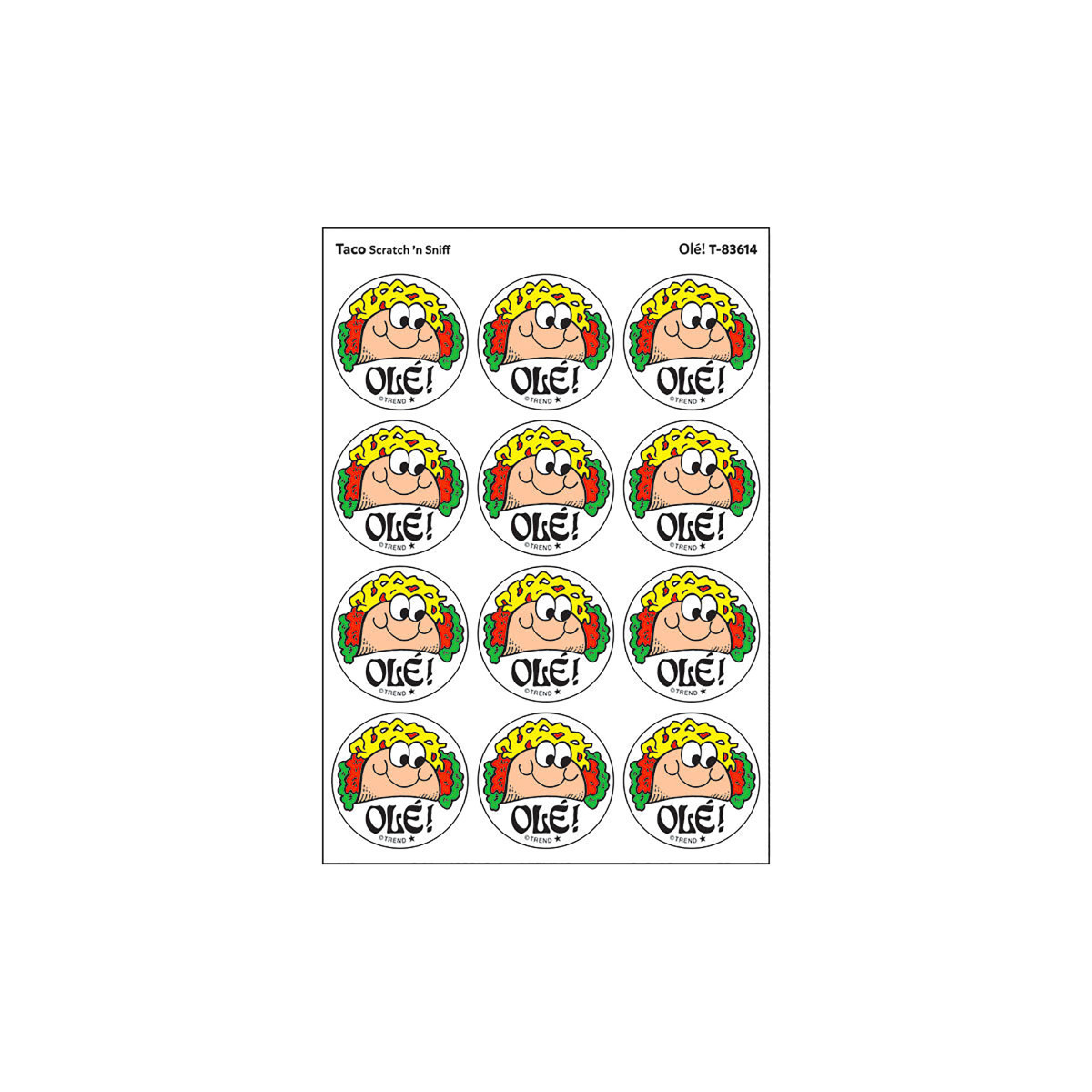 Get a whiff of this Ole!, taco-scented sticker! TREND Scratch 'n Sniff Stinky Stickers from the '80s are BACK! Fun to collect, trade, and celebrate accomplishments and special occasions. Collectors will be happy to spot the star symbol to distinguish TREND Retro Stinky Stickers from those printed in the 1980s. Each pack includes 24 stickers on 2 sheets.