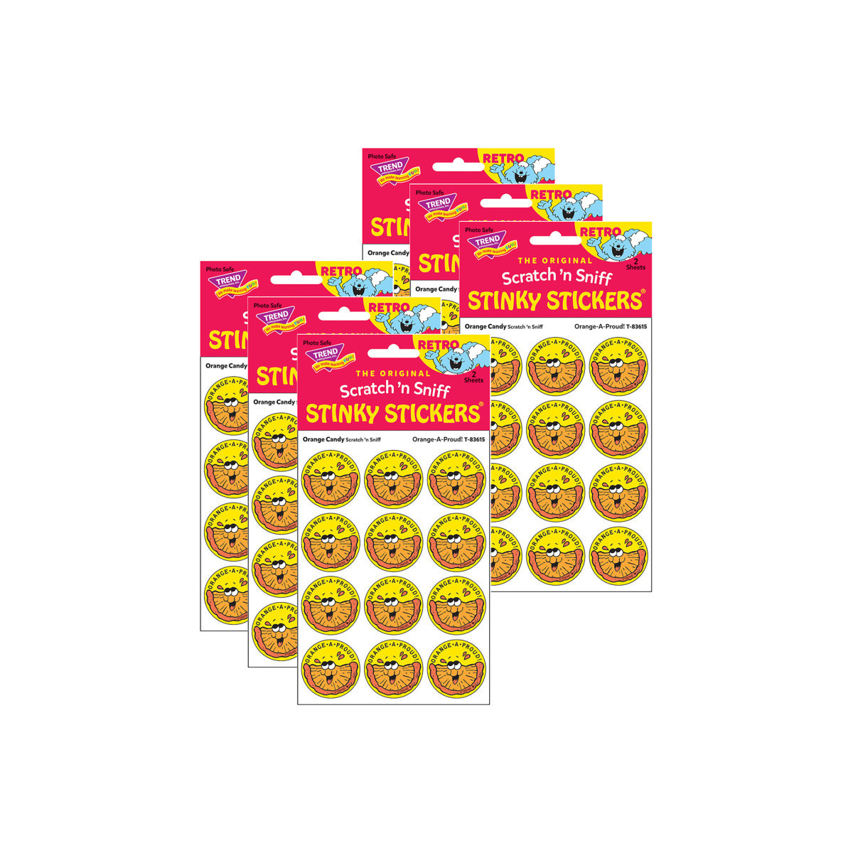 Get a whiff of this Orange-A-Proud, orange candy-scented sticker! TREND Scratch 'n Sniff Stinky Stickers from the '80s are BACK! Fun to collect, trade, and celebrate accomplishments and special occasions. Collectors will be happy to spot the star symbol to distinguish TREND Retro Stinky Stickers from those printed in the '80s. Each pack includes 24 stickers on 2 sheets. Sold as 6 packs for a total of 244 stickers.