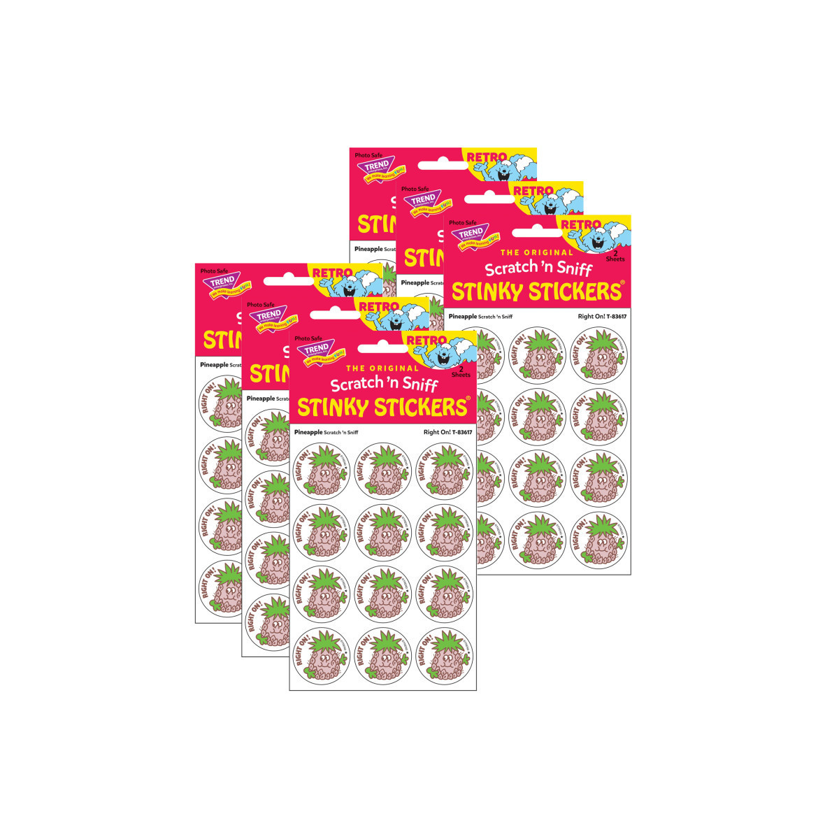 Get a whiff of this Right On, pineapple-scented sticker! TREND Scratch 'n Sniff Stinky Stickers from the '80s are BACK! Fun to collect, trade, and celebrate accomplishments and special occasions. Collectors will be happy to spot the star symbol to distinguish TREND Retro Stinky Stickers from those printed in the 1980s. Each pack includes 24 stickers on 2 sheets. Sold as 6 packs for a total of 244 stickers.