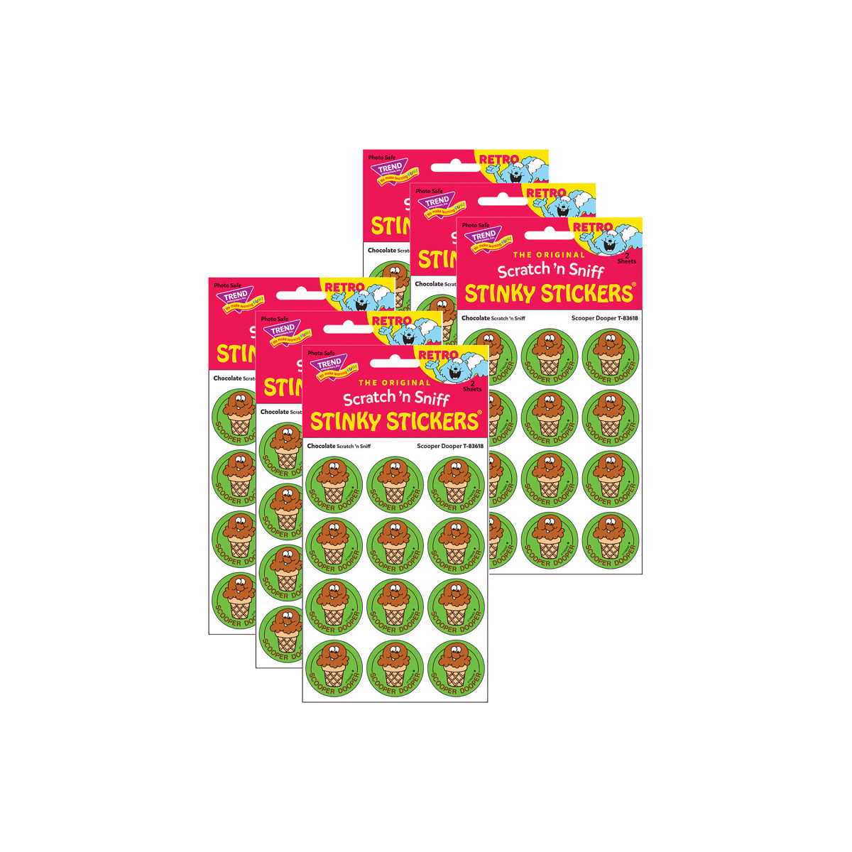 Get a whiff of this Scooper Dooper, chocolate-scented sticker! TREND Scratch 'n Sniff Stinky Stickers from the '80s are BACK! Fun to collect, trade, and celebrate accomplishments and special occasions. Collectors will be happy to spot the star symbol to distinguish TREND Retro Stinky Stickers from those printed in the 1980s. Each pack includes 24 stickers on 2 sheets. Sold as 6 packs for a total of 244 stickers.