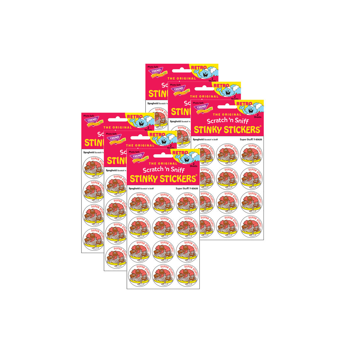 Get a whiff of this Super Stuff, spaghetti-scented sticker! TREND Scratch 'n Sniff Stinky Stickers from the '80s are BACK! Fun to collect, trade, and celebrate accomplishments and special occasions. Collectors will be happy to spot the star symbol to distinguish TREND Retro Stinky Stickers from those printed in the 1980s. Each pack includes 24 stickers on 2 sheets. Sold as 6 packs for a total of 244 stickers.