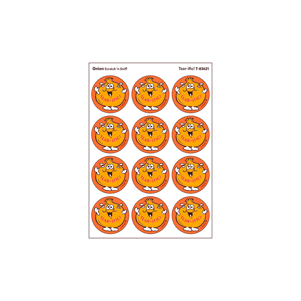 Get a whiff of this Tear-ific, onion-scented sticker! TREND Scratch 'n Sniff Stinky Stickers from the '80s are BACK! Fun to collect, trade, and celebrate accomplishments and special occasions. Collectors will be happy to spot the star symbol to distinguish TREND Retro Stinky Stickers from those printed in the 1980s. Each pack includes 24 stickers on 2 sheets.