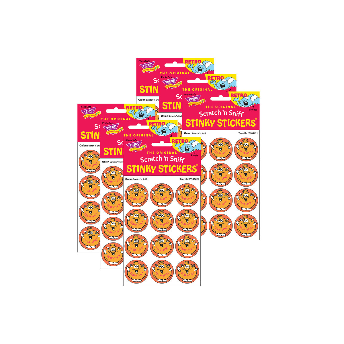 Get a whiff of this Tear-ific, onion-scented sticker! TREND Scratch 'n Sniff Stinky Stickers from the '80s are BACK! Fun to collect, trade, and celebrate accomplishments and special occasions. Collectors will be happy to spot the star symbol to distinguish TREND Retro Stinky Stickers from those printed in the 1980s. Each pack includes 24 stickers on 2 sheets. Sold as 6 packs for a total of 244 stickers.
