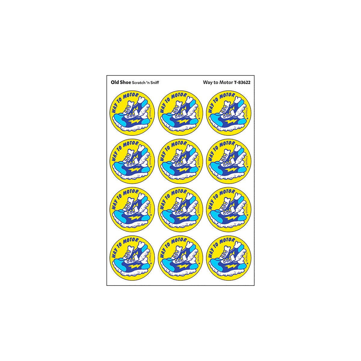 Get a whiff of this Way to Motor, old shoe-scented sticker! TREND Scratch 'n Sniff Stinky Stickers from the '80s are BACK! Fun to collect, trade, and celebrate accomplishments and special occasions. Collectors will be happy to spot the star symbol to distinguish TREND Retro Stinky Stickers from those printed in the 1980s. Each pack includes 24 stickers on 2 sheets.