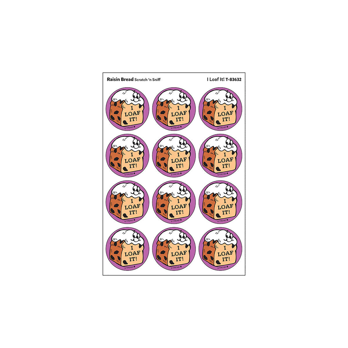 Get a whiff of this I Loaf It!, raisin bread-scented sticker! TREND Scratch 'n Sniff Stinky Stickers® from the '80s are BACK! Fun to collect, trade, and celebrate accomplishments and special occasions. Collectors will be happy to spot the ˜… to distinguish TREND Retro Stinky Stickers® from those printed in the 1980s. Each sticker 1.25" diameter. Each pack includes 24 stickers on 2 sheets in 1 design.