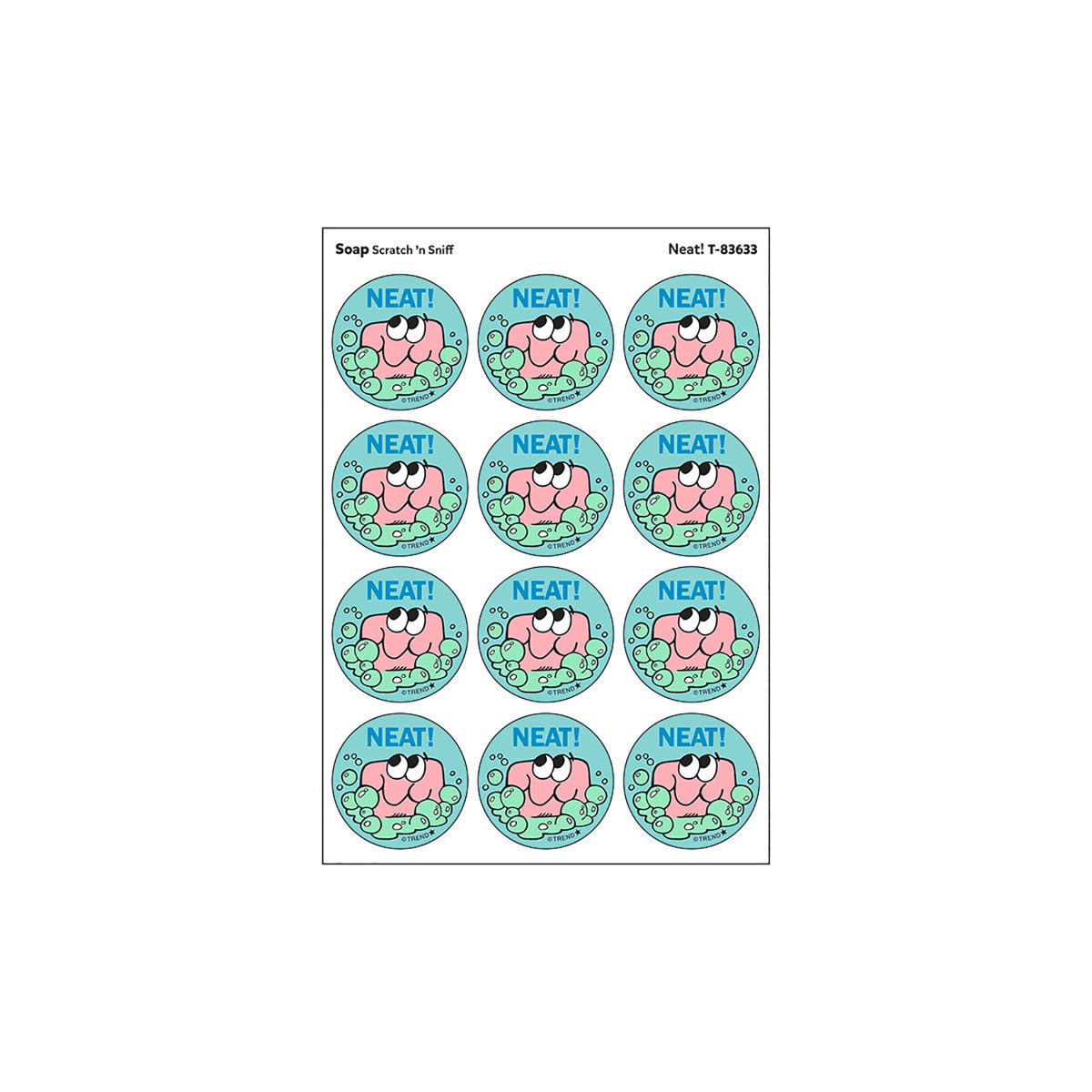 Get a whiff of this Neat!, soap-scented sticker! TREND Scratch 'n Sniff Stinky Stickers® from the '80s are BACK! Fun to collect, trade, and celebrate accomplishments and special occasions. Collectors will be happy to spot the ˜… to distinguish TREND Retro Stinky Stickers® from those printed in the 1980s. Each sticker 1.25" diameter. Each pack includes 24 stickers on 2 sheets in 1 design.