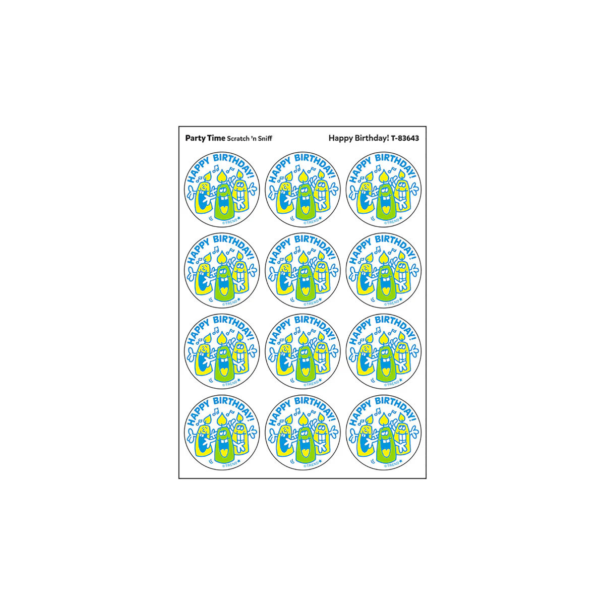 Get a whiff of this Happy Birthday!, party time-scented sticker! TREND Scratch n Sniff Stinky Stickers from the '80s are BACK! Fun to collect, trade, and celebrate accomplishments and special occasions. Collectors will be happy to spot the star symbol to distinguish TREND Retro Stinky Stickers from those printed in the 1980s. Each pack includes 2 sheets / 24 stickers, measuring 1-1/4" diameter. Ages 3 and up. Made in the USA.
