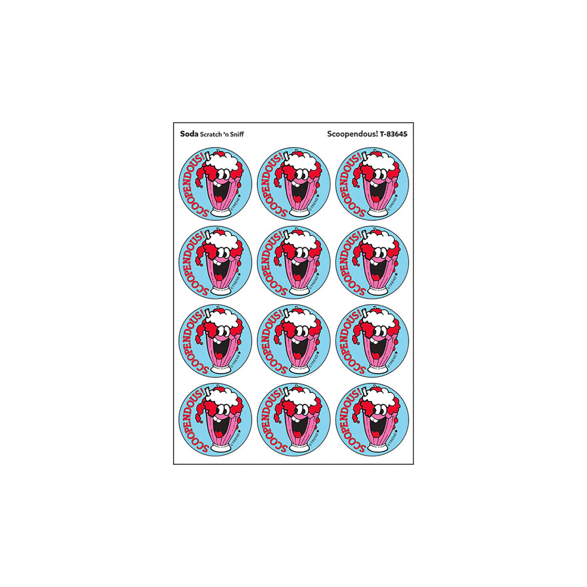 Get a whiff of this Scoopendous!, soda-scented sticker! TREND Scratch n Sniff Stinky Stickers from the '80s are BACK! Fun to collect, trade, and celebrate accomplishments and special occasions. Collectors will be happy to spot the star symbol to distinguish TREND Retro Stinky Stickers from those printed in the 1980s. Each pack includes 2 sheets / 24 stickers, measuring 1-1/4" diameter. Ages 3 and up. Made in the USA.