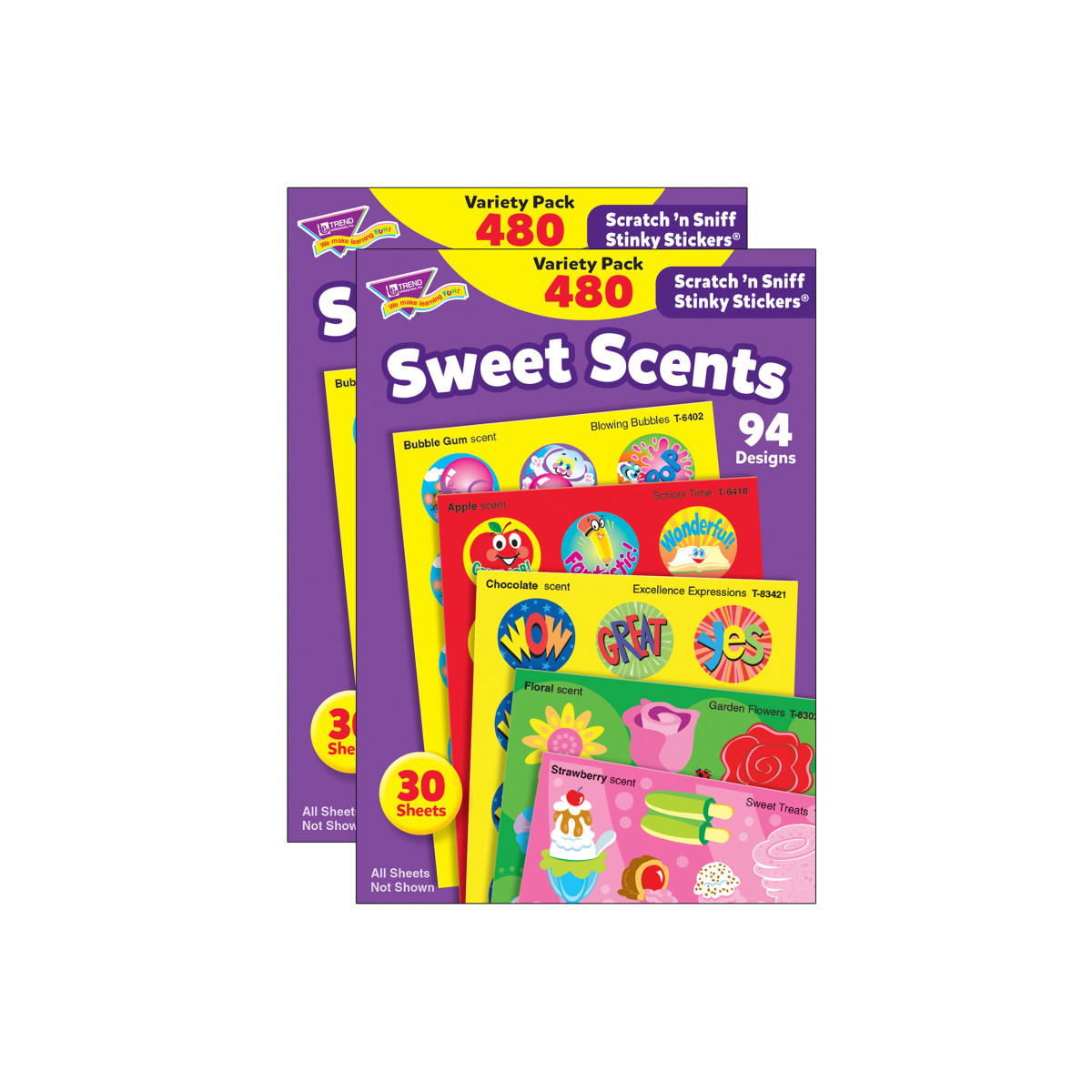 Scratch 'em and sniff 'em for a burst of fragrance! Everyone's favorite stickers, Stinky Stickers are fun to collect or use to motivate and reward. Designs include Picnic, Crayons, Bubbles, Sea Animals, Peppermints, Farm, School Time, Sun & Fun, Sports, Excellence Expressions, Sweet Treats, Flowers, and Big Birthday. Designs may vary. Acid-free, nontoxic, and safe for use on photos. 94 designs, 483 stickers, 12 scents per pack. Sold as 2 packs for a total of 966 stickers.