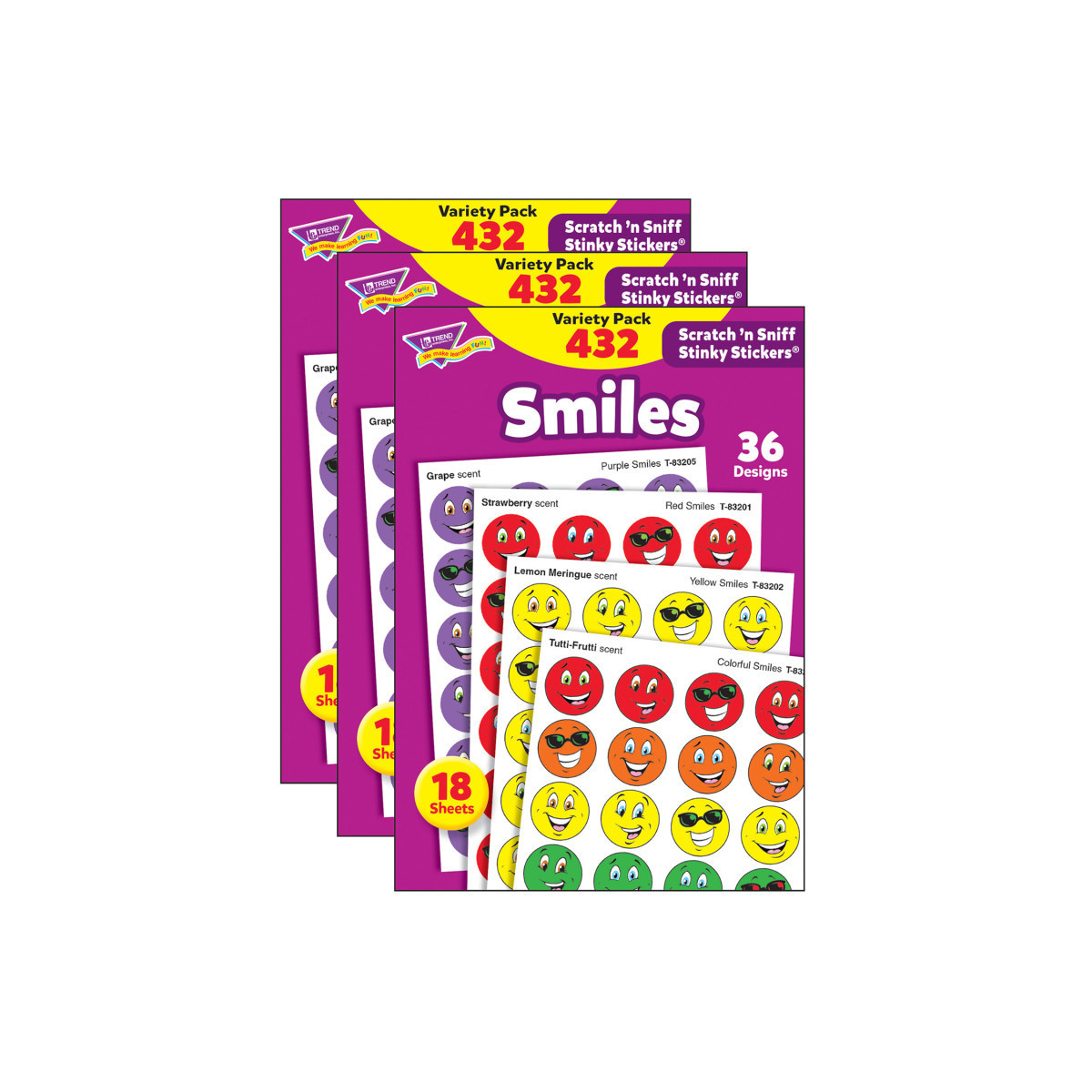 Scratch 'em and sniff 'em for a burst of fragrance! Everyone's favorite stickers, Stinky Stickers are fun to collect or use to motivate and reward. Designs include smiles in red, yellow, purple, orange, green, and blue. Designs may vary. Acid-free, nontoxic, and safe for use on photos. 36 designs, 432 stickers, 4 scents per pack. Sold as 3 packs for a total of 1296 stickers.