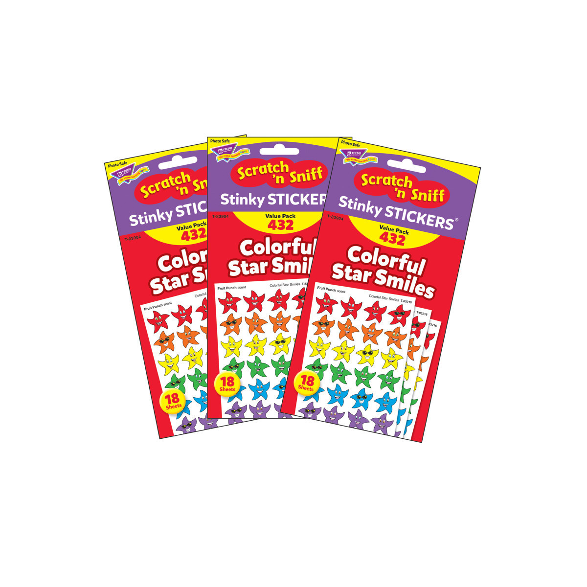 Scratch 'em and sniff 'em for a burst of fragrance! Everyone's favorite stickers, Stinky Stickers are fun to collect or use to motivate and reward. Designs include Colorful Star Smiles in red, orange, yellow, green, blue, and purple. Designs may vary. Acid free, nontoxic, and safe for use on photos. 24 designs, 432 stickers, 1 scent per pack. Sold as 3 packs for a total of 1296 stickers.