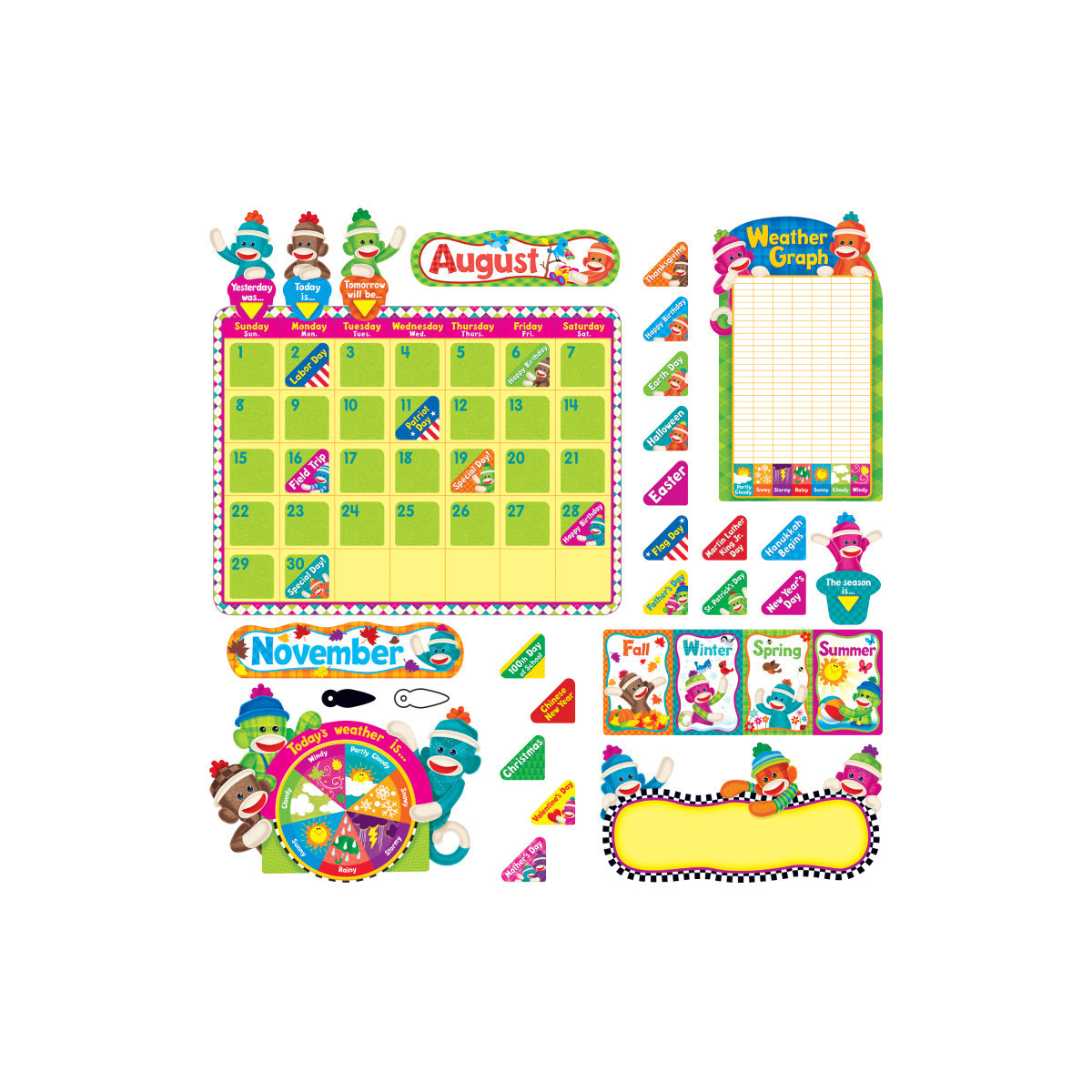- Adorable sock monkeys help students plan and track months, special occasions, seasons, and weather.