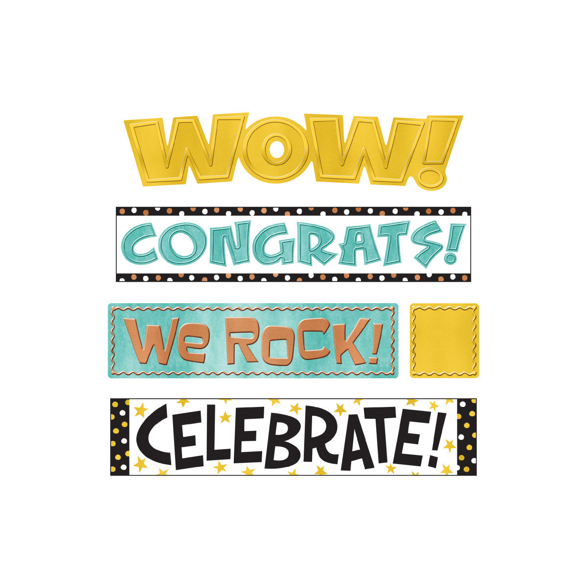 Let's celebrate! 6 signs set the stage for any occasion: Way to SHINE!, CELEBRATE!, HAPPY DAY!, We Rock!, CONGRATS!, and WOW!. Includes 3 small signs to add names or messages. Largest sign is 25.5" long. 9 pieces.