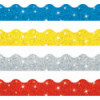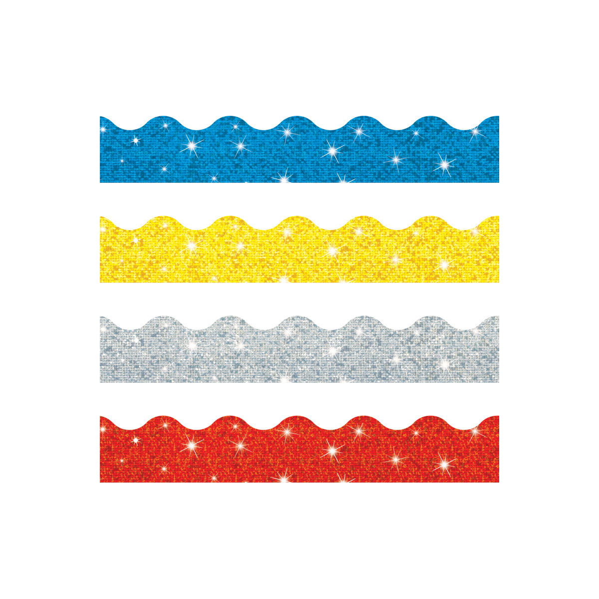 Irresistible designs at your fingertips! Spruce up your spaces and rev up the fun with a convenient Variety Pack of Terrific Trimmers. Vibrant, contemporary designs create cheerful, inspiring classrooms, add pizzazz to parties and events, inspire clever hats 'n crowns, and dress up storage containers, cubbies, and shelves. Layer patterns on solids, sparkles, or metallics for extra WOW! Durable and reusable. Includes Blue Sparkle, Silver Sparkle, Yellow Sparkle, and Red Sparkle Terrific Trimmers. Includes 130' total.