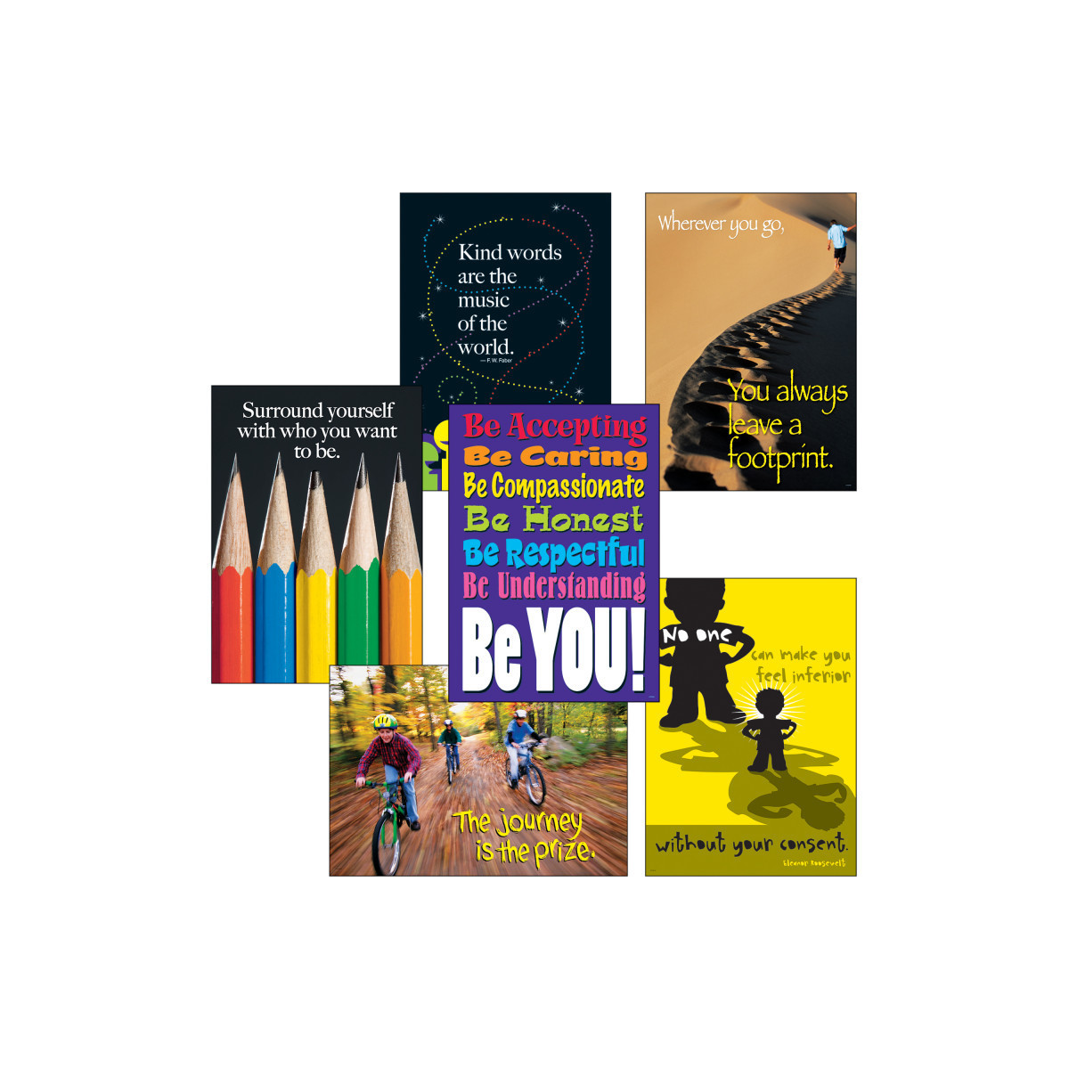 Lively visuals and popular themes energize learning, spark discussions, build character, and encourage new ways of looking at life. The results are motivated, successful individuals who reflect the positive attitudes and behaviors portrayed in these creative themes. Includes Be Accepting, Surround yourself with who you want to be, Kind words are the music of the world, The journey is the prize, Wherever you go you always leave a footprint, and No one can make you feel inferior without your consent. Versatile and durable. Value-packed savings! 6 posters, 13.375" x 19". Use TREND Poster Storage Boxes.