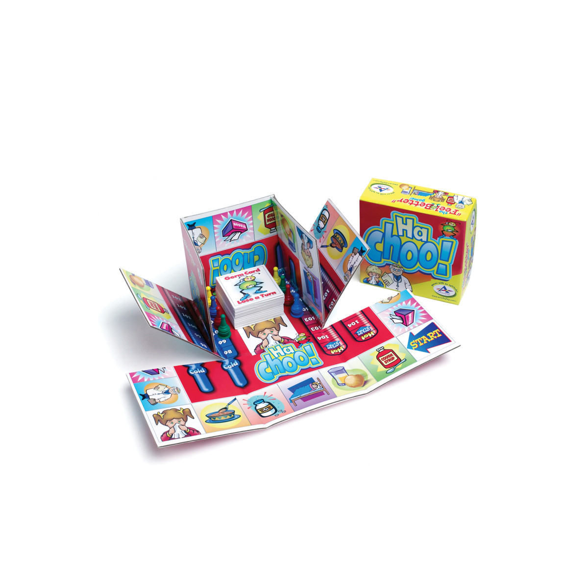 Ha Choo is an exciting board game, designed to be both educational and fun, with the emphasis on fun! All players start out with fevers-the first one to reduce their fever back to normal with the proper ingredients is the winner! The excitement is generated in three ways: players collect playing cards, players reduce their fevers on their own thermometer by discarding cards, and players participate vocally when they land on special spaces! Ha Choo will teach the basic principles of good health and can reduce the worry and questions about first doctor's office visits. Ages 4 and Up, 2 to 4 Players