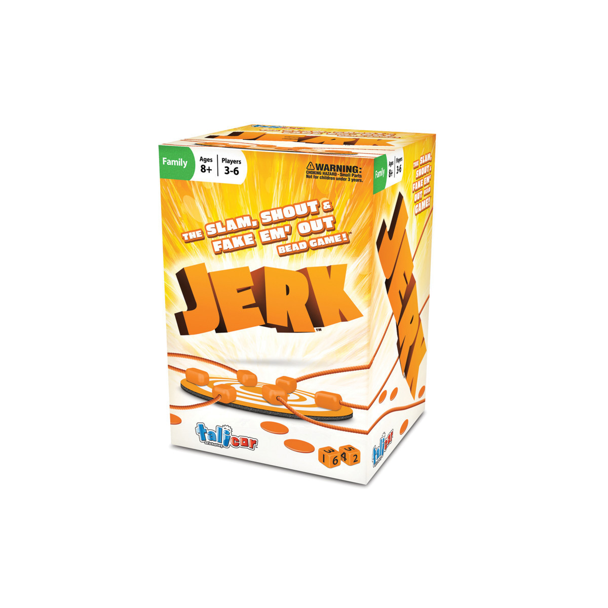 THE SLAM, SHOT-FAKE EM' OUT BEAD GAME! Jerk is the all-in, all-out silly bead on a string game of psych-out! The party will be roaring with laughter when players try to escape the megaphone each round and JERK their bead to safety. All players start each round with their bead in the center ring. To avoid capture, JERK your bead to safety when a 7, 11 or doubles is rolled by the SLAMMER, (the player trying to trap you). For every successful bead escape players receive a token from the SLAMMER. But be weary of the Fake-Out! The SLAMMER can yell, scream and shout out false numbers to confuse players. If you pull away by mistake YOU pay the SLAMMER. Winner takes all in the frantic game of reflexes. For 3-6 players, ages 8+.