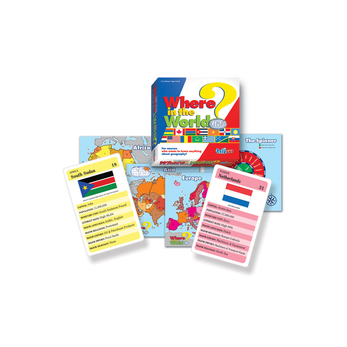 When Where in the World was introduced 16 years ago it launched the trend in geography games. Today, this game remains the most comprehensive world geography games that families and classrooms love! The game has been updated to include the latest facts about every country in the world including capitals, major imports and exports, languages and religions. With 6 games in one, it's possible for players of all abilities to play together providing challenge and a world of fun for everyone. For 2-6 players, ages 8 and up. 25+ minutes.