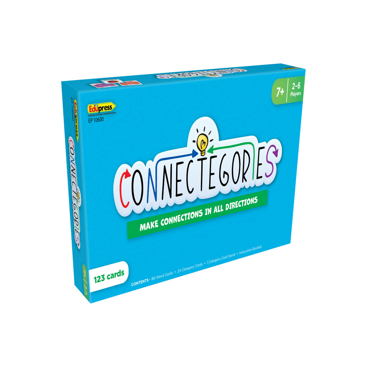 Connectegories is a strategic word game that will get learners of all ages to find and make connections between words. The game includes 99 Word Cards (each featuring the spelling and photo of a common word), 24 Category Cards (each naming a category based on the meaning or construction of the words), and a Category Card Stand. Players activate a new Category Card or use one already on the board. They then connect Word Cards that fit into those categories and try to maximize points by making connections in more than one direction. Watch a web of words grow as the connections take hold! Includes 1 category card stand and an instruction booklet.