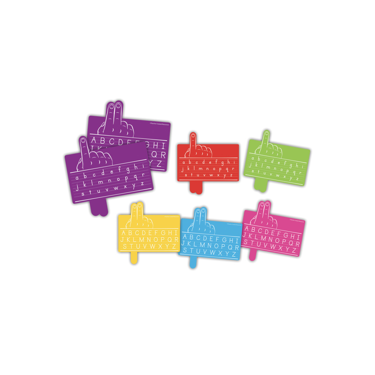 Finger spacers are a convenient tool to help children control letter spacing between words and sentences. Featuring single-finger and double-finger guides, children can practice word spacing effectively—using one finger between words and two fingers between sentences. Spacers are double-sided with uppercase letters on one side and lowercase letters on the other for quick reference. Each Finger Spacer measures 3-1/2" x 3-1/2". Each pack includes 30 finger spacers, 5 each of 6 colors: red, yellow, lime, aqua, purple, and pink.