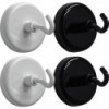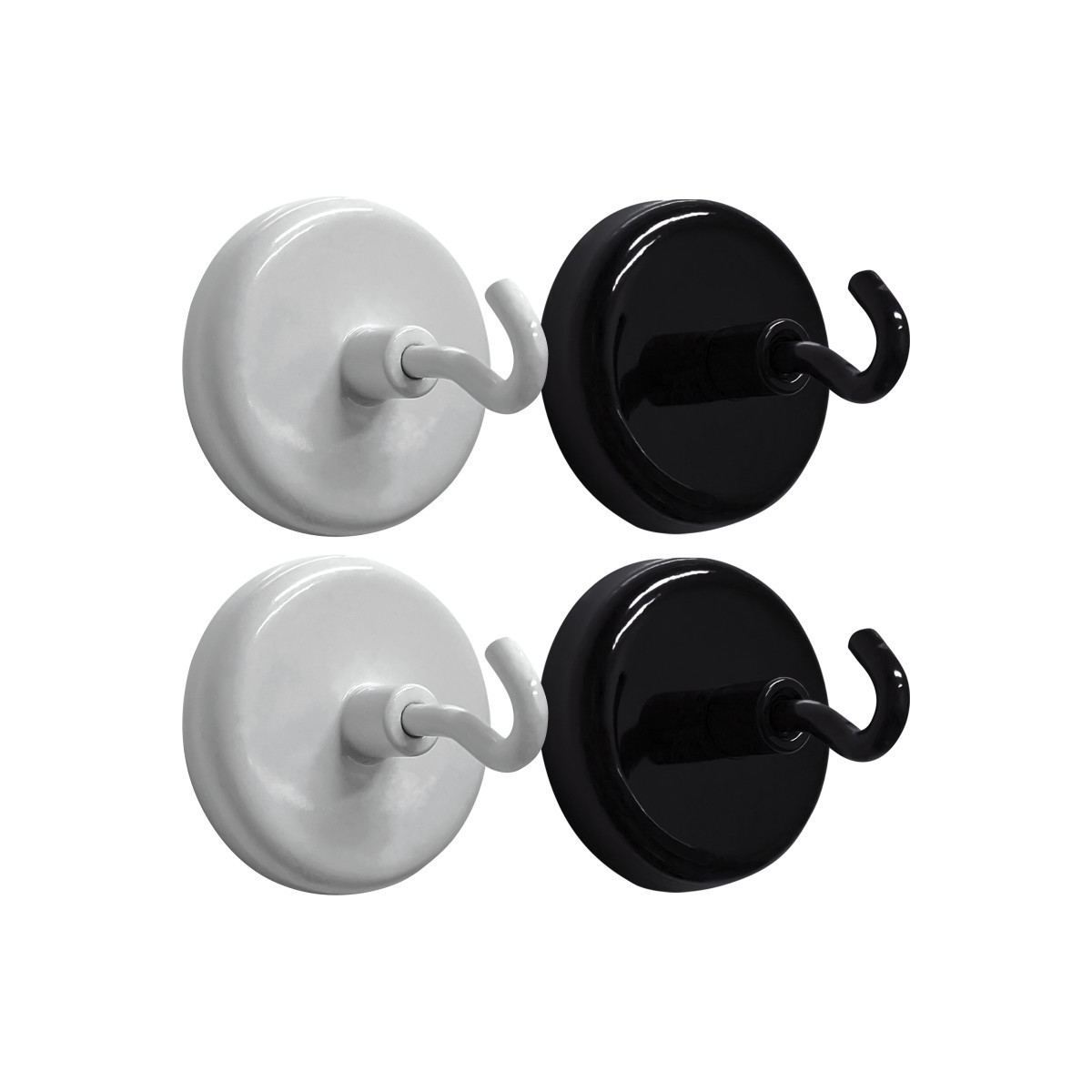 Strong magnets and durable metal construction. Can hold over 80 pieces of 8-1/2" x 11" paper. Each base measures 1-1/2" in diameter. Each pack includes 4 magnetic hooks, 2 black and 2 white.