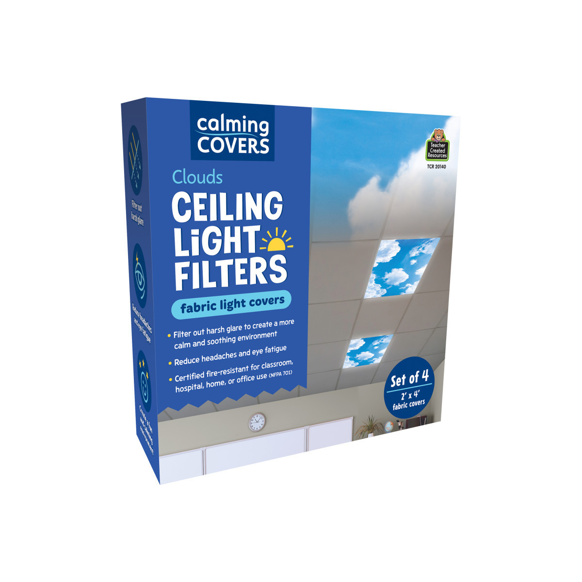 These visually appealing fabric light covers filter out harsh glare to create a more calm and soothing environment. They can also reduce headaches and eye fatigue. Fits most 2' x 4' ceiling light fixtures. The fire-resistant fabric conforms to fire safety standards. Full coverage with no gaps. Easy installation – no tools required. 10 extra-strong magnets help prevent the fabric from sagging. Subdue overwhelming fluorescent and LED light bulbs! Reduce eye strain and minimize annoying light flickers! Pack of 4 light filters.