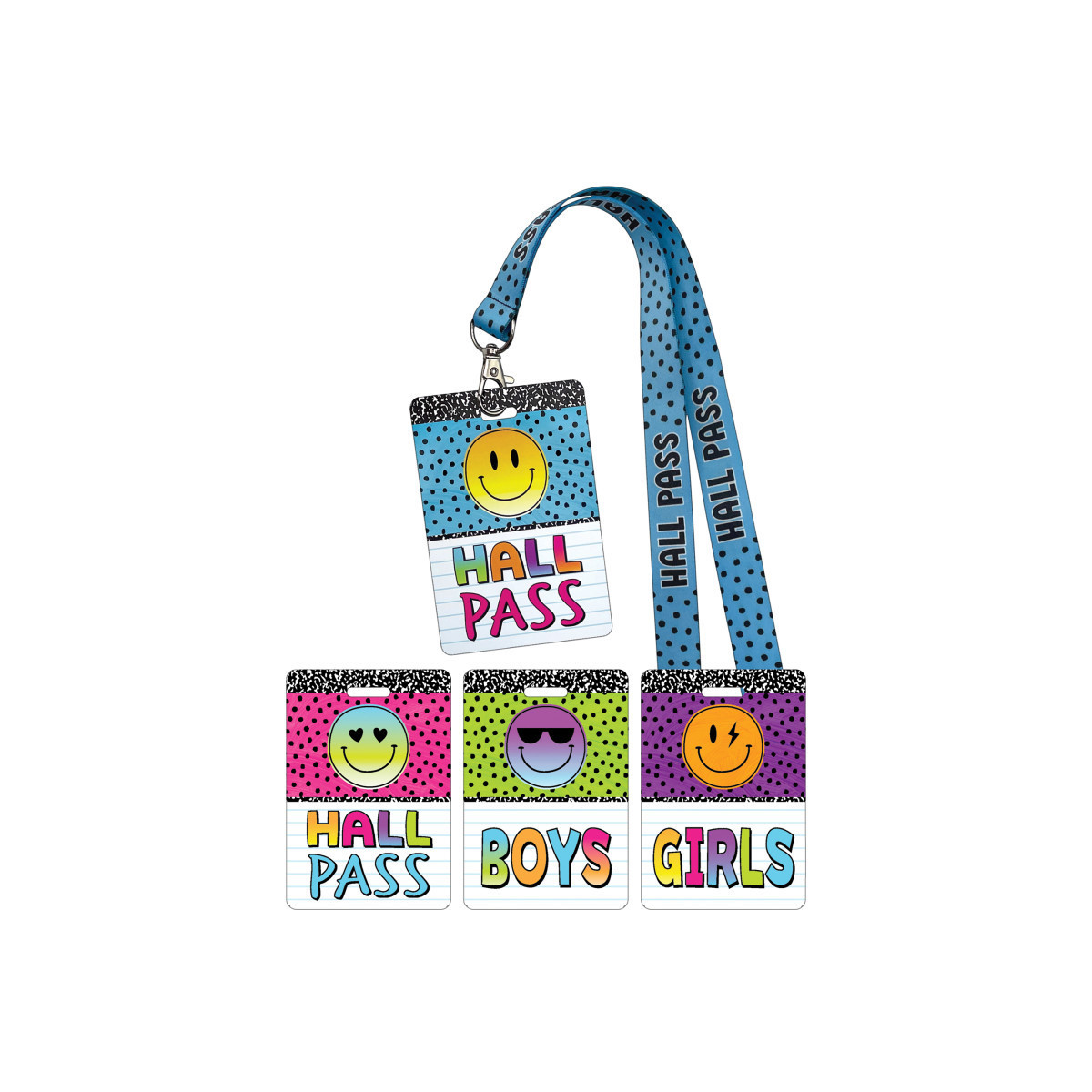 These hall passes are the perfect blend of functionality, convenience, and style for your classroom. Each durable hall pass is double-sided with a sturdy swiveling metal clasp and safety breakaway clip. 4 durable, double-sided passes (2 hall passes, 1 boys pass, and 1 girls pass). Matching fabric lanyards with safety breakaway clips. Sturdy, swiveling metal clasp. Easy to clean and sanitize.
